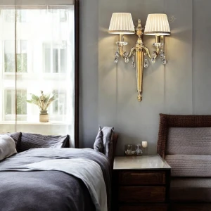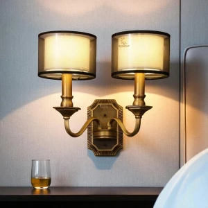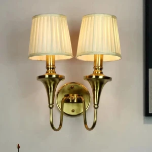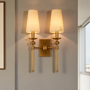 Antique Gold Finish Double Head Fabric Lampshade Wall Lamp - Warm White