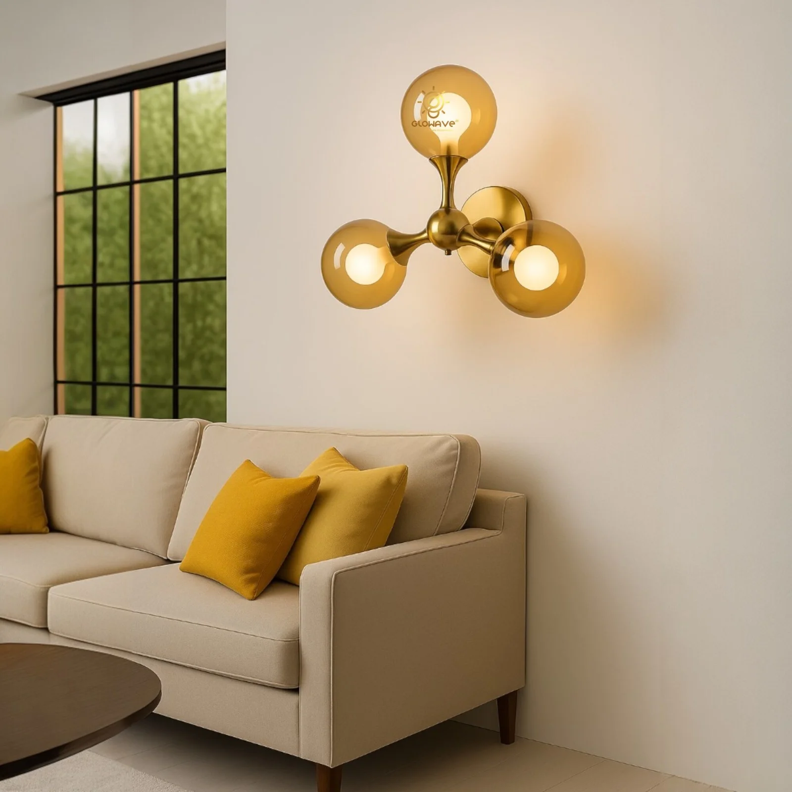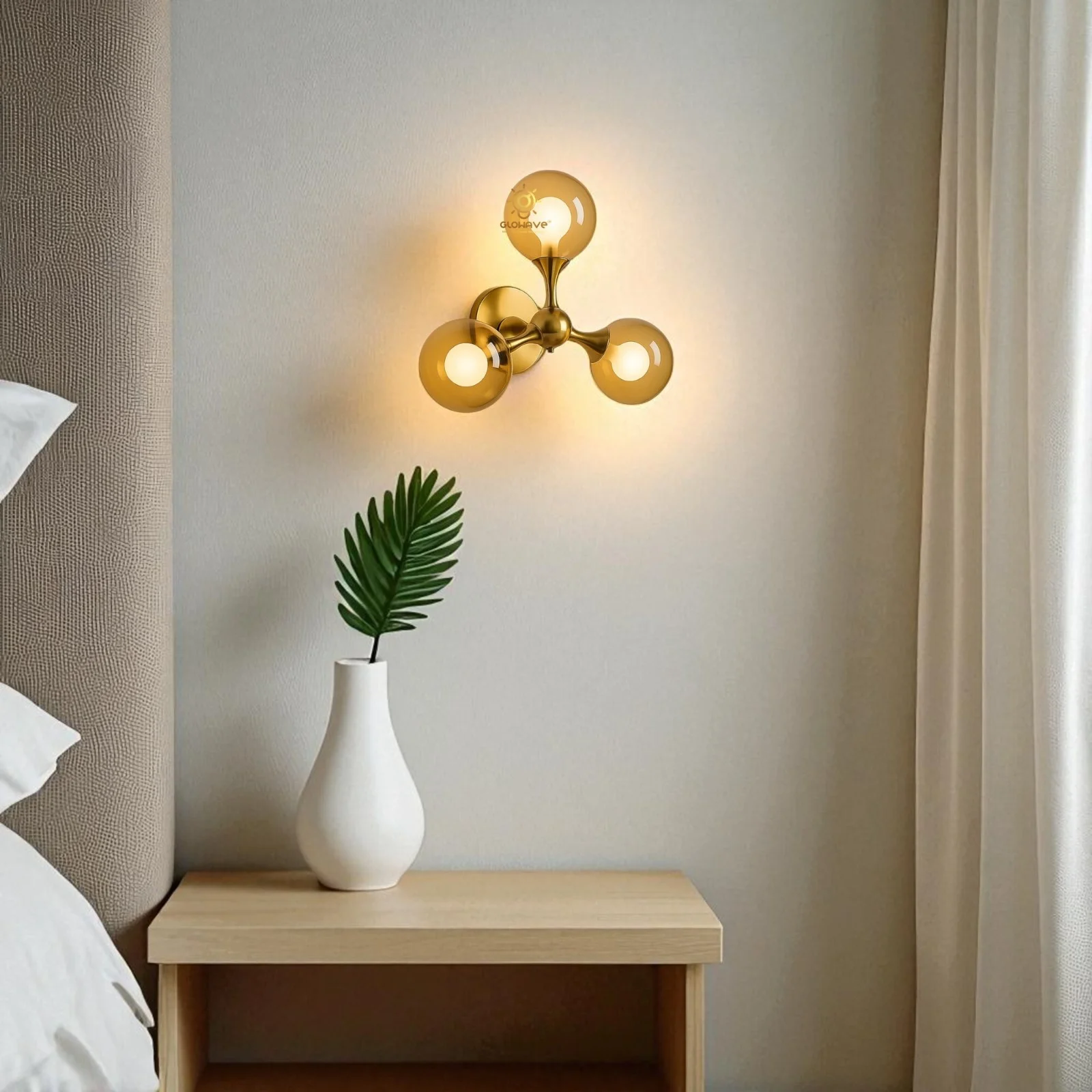 Elevate your living space with the Modern 3 Amber Glass Sconce Circular Shape Balls Blub Wall Lamp. This elegant lighting fixture, perfect for your living room, bedroom, or bedside, features a sleek Black finish and contemporary glass balls design.