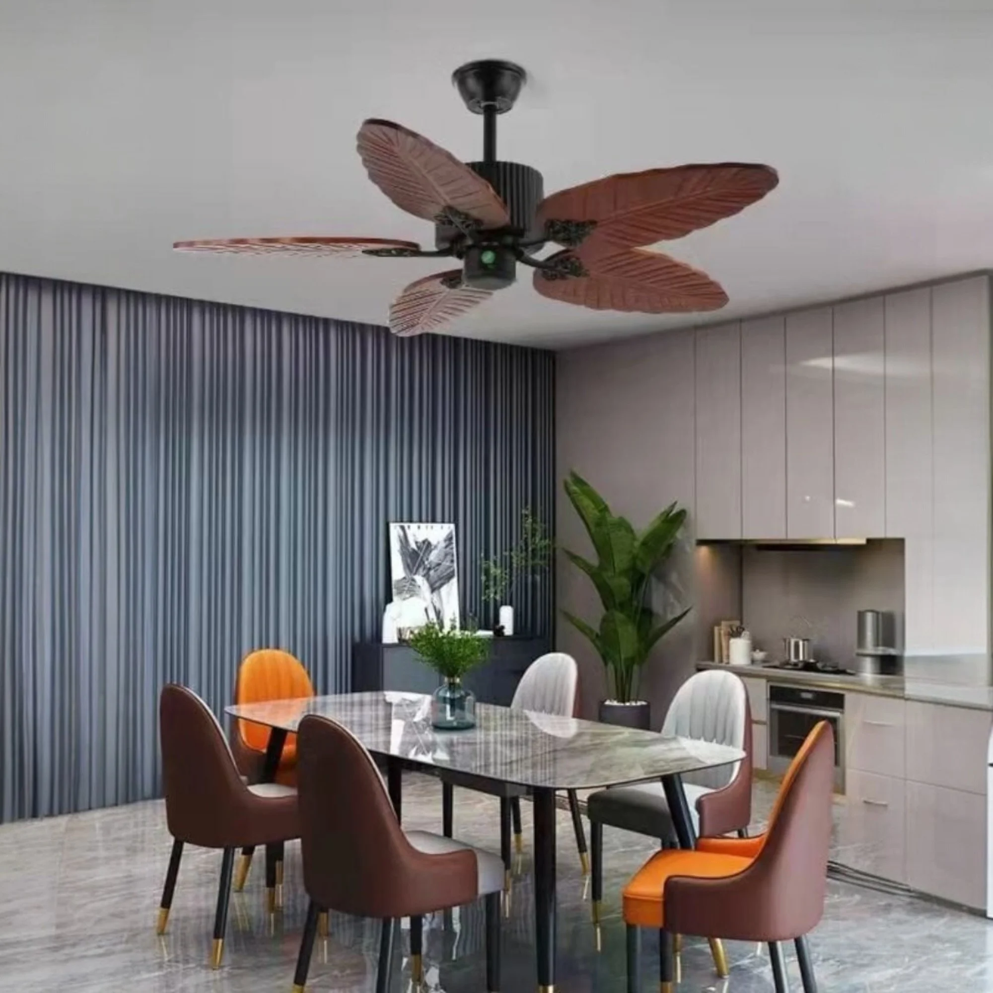 - Elegant Design: Features a durable metal body with five brown ABS blades disguised as palm leaf