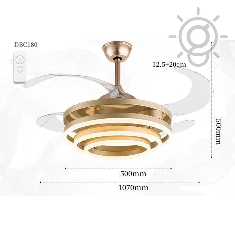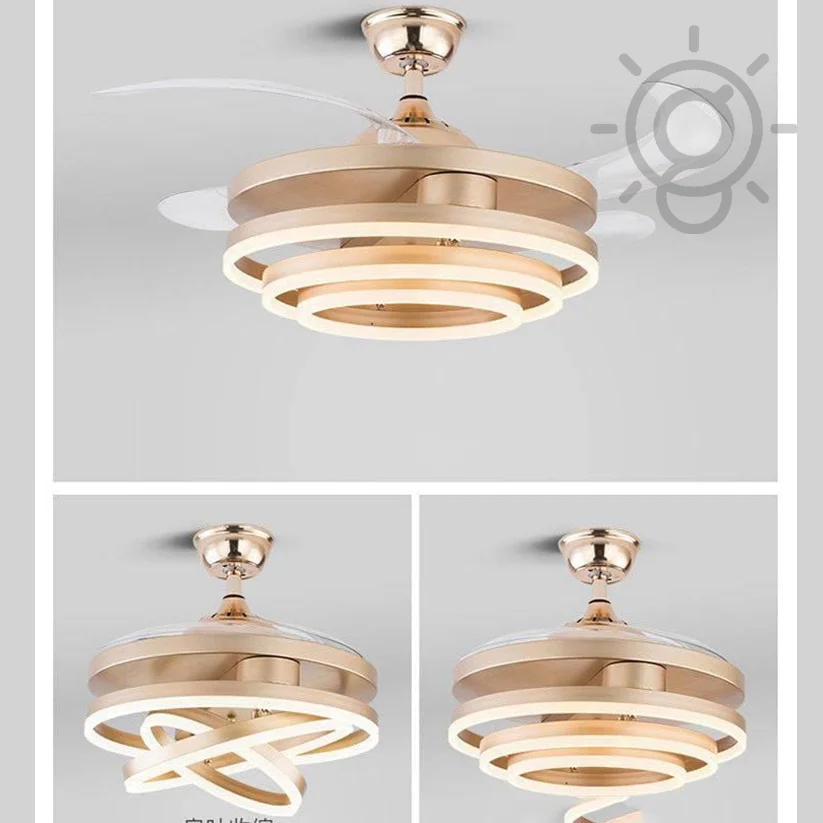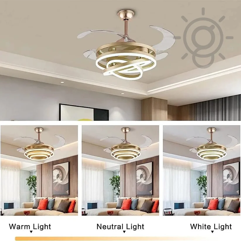 Elevate your living space with the Luxury Golden Acrylic Ceiling Fan Chandelier. This stunning retractable fan lighting fixture features a sophisticated design with sparkling rings accents, adding a touch of luxury to any room. With three adjustable color lights, it seamlessly adapts to your desired ambiance. Ideal for living rooms, bedrooms, dining areas, entrances, showrooms, and cafés, this versatile chandelier combines style and functionality. The retractable blades provide efficient air circulation when extended and a sleek, unobtrusive look when retracted. Enjoy a blend of elegance and practicality with this exquisite ceiling fan chandelier.