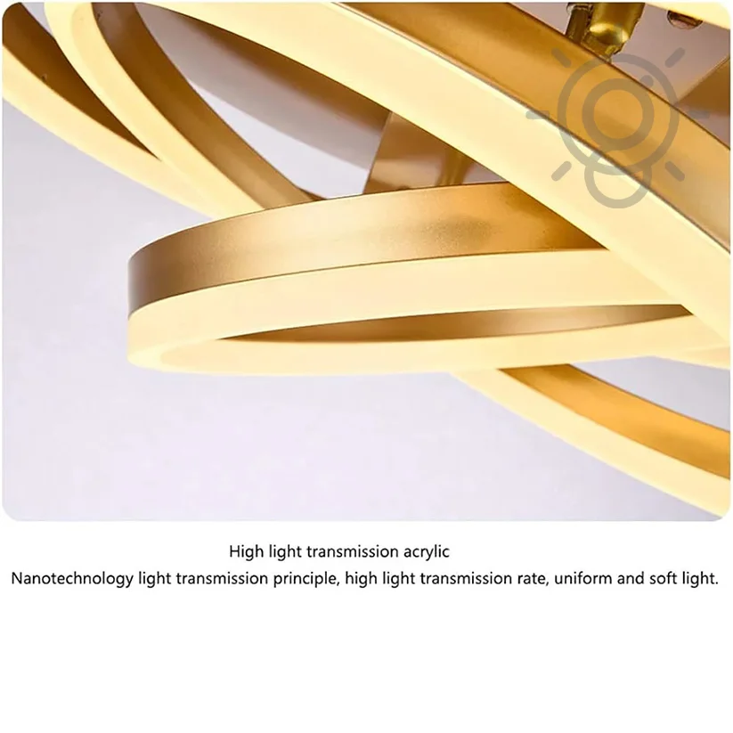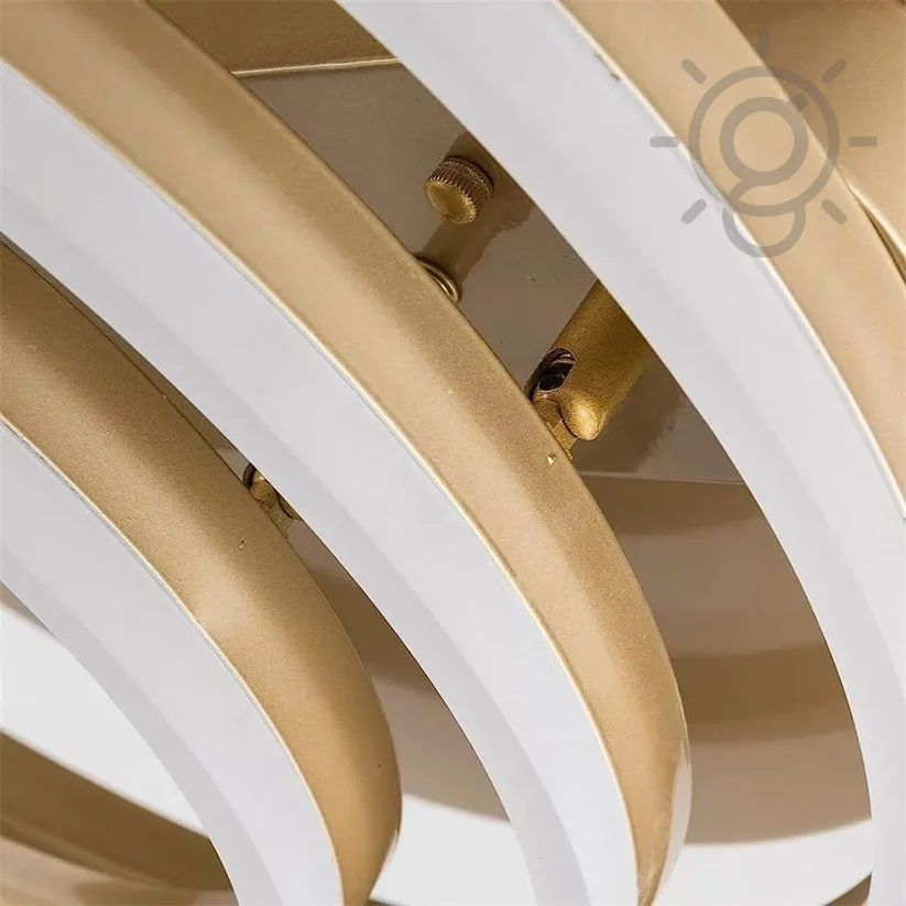 - Metal body Golden Rings with Acrylic Lampshade, and ABS fan blades with copper binding motor chandelier.