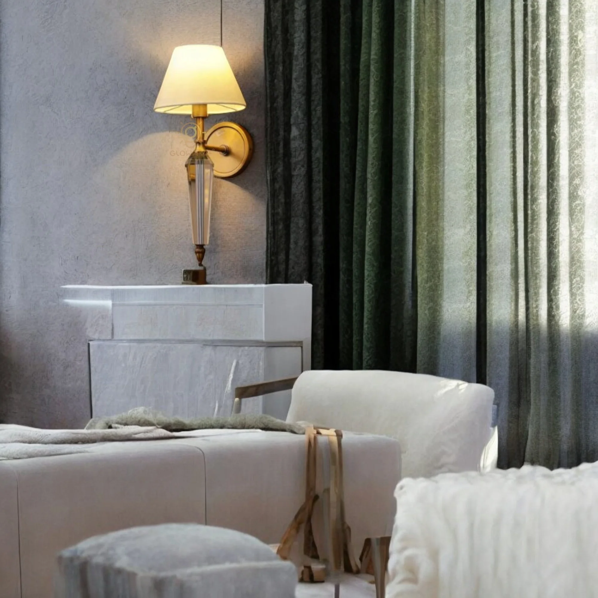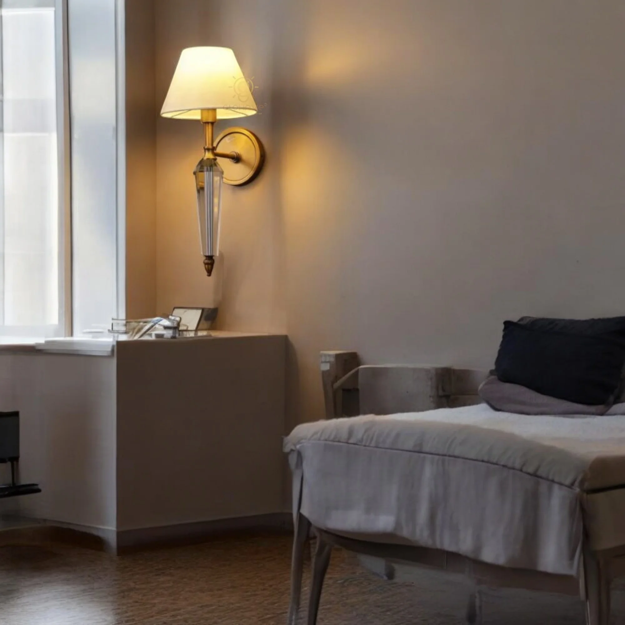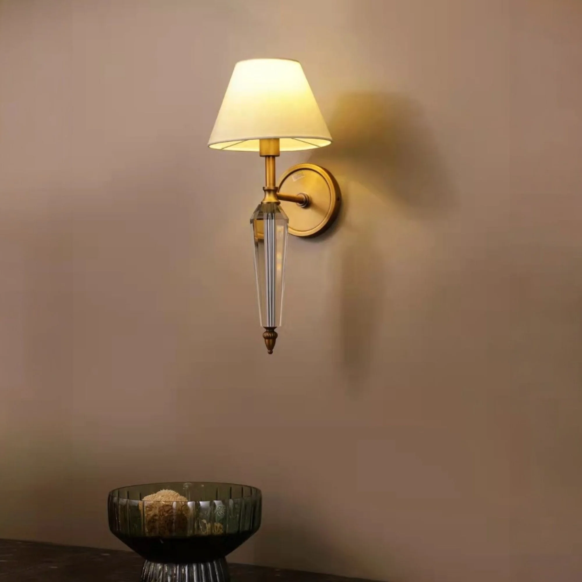 Enhance your home decor with the Gold Finish Crystal Fabric Shade Wall Lamp. This exquisite sconce fixture, perfect for living rooms, bedrooms, and bedsides, boasts a timeless antique brass finish and clear glass design. It casts a warm white light, creating a cozy and nostalgic atmosphere. Ideal for adding vintage charm to any space.