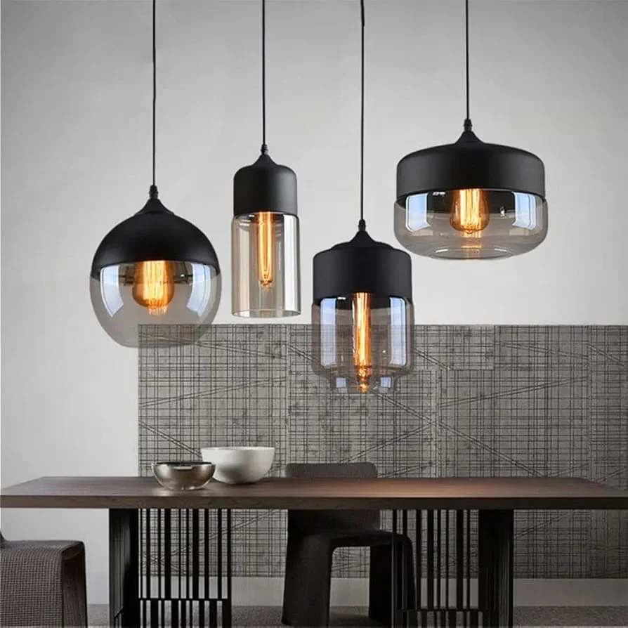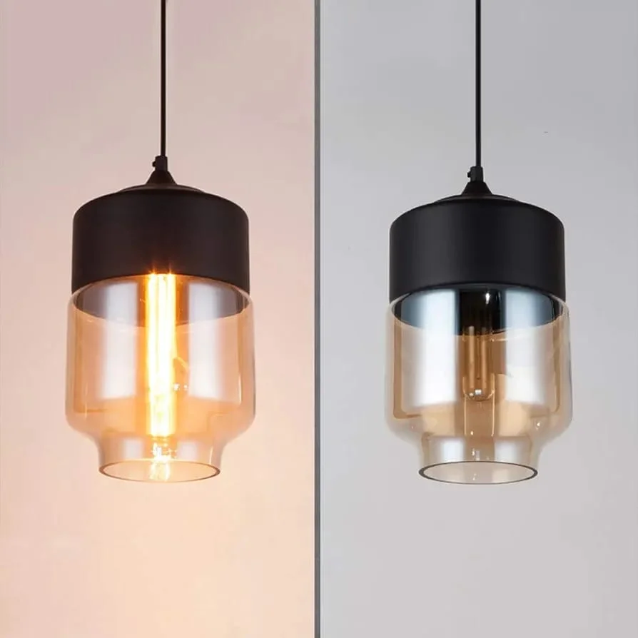 Black Finish Amber Glass Pendant Hanging Light - Warm White