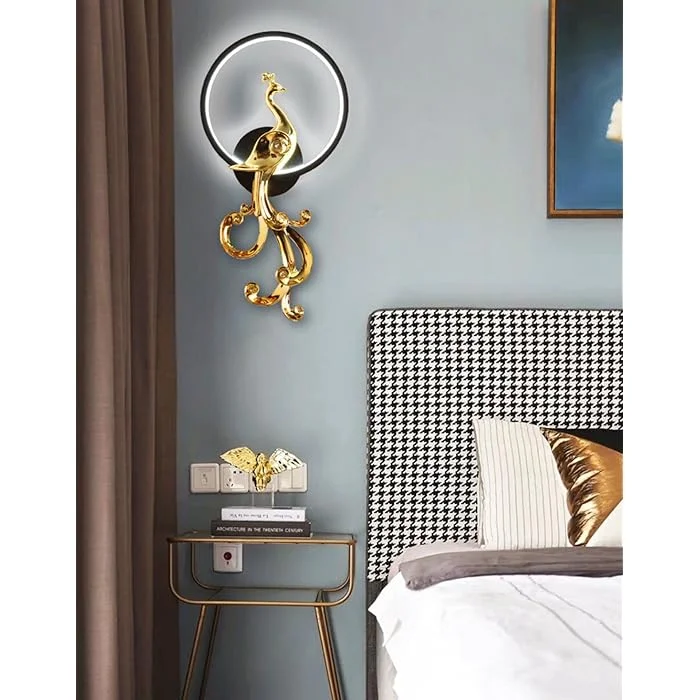 Elevate your living space with the Modern Black Golden Finish Peacock LED Wall Lamp. This elegant lighting fixture, perfect for your living room, bedroom, or bedside, features a sleek golden finish and contemporary oval design. It provides a warm white, White and natural white glow that creates a cozy ambiance.