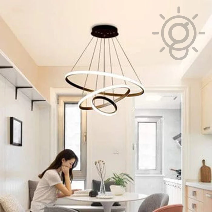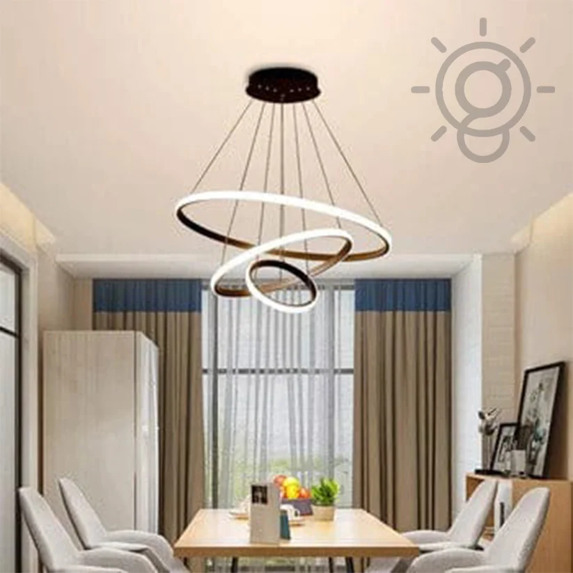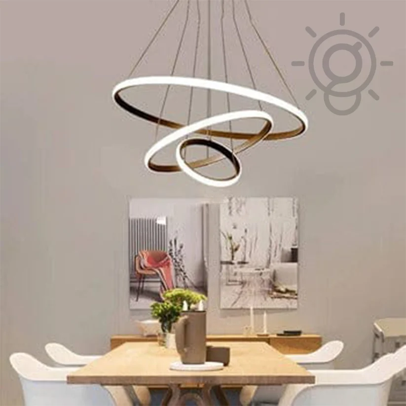 Elevate your space with the Modern LED Metal 3 Rings Black Pendant Chandelier Light. Perfect for kitchens, cafes, and dining bars, this stunning fixture offers tricolour lighting options: Warm White, White, and Natural White. The sleek golden metal design adds a touch of elegance and modernity, making it a versatile and stylish choice for any setting. Ideal for contemporary interiors, this chandelier enhances ambiance while providing efficient LED lighting. Transform your space with this exquisite hanging light today!
