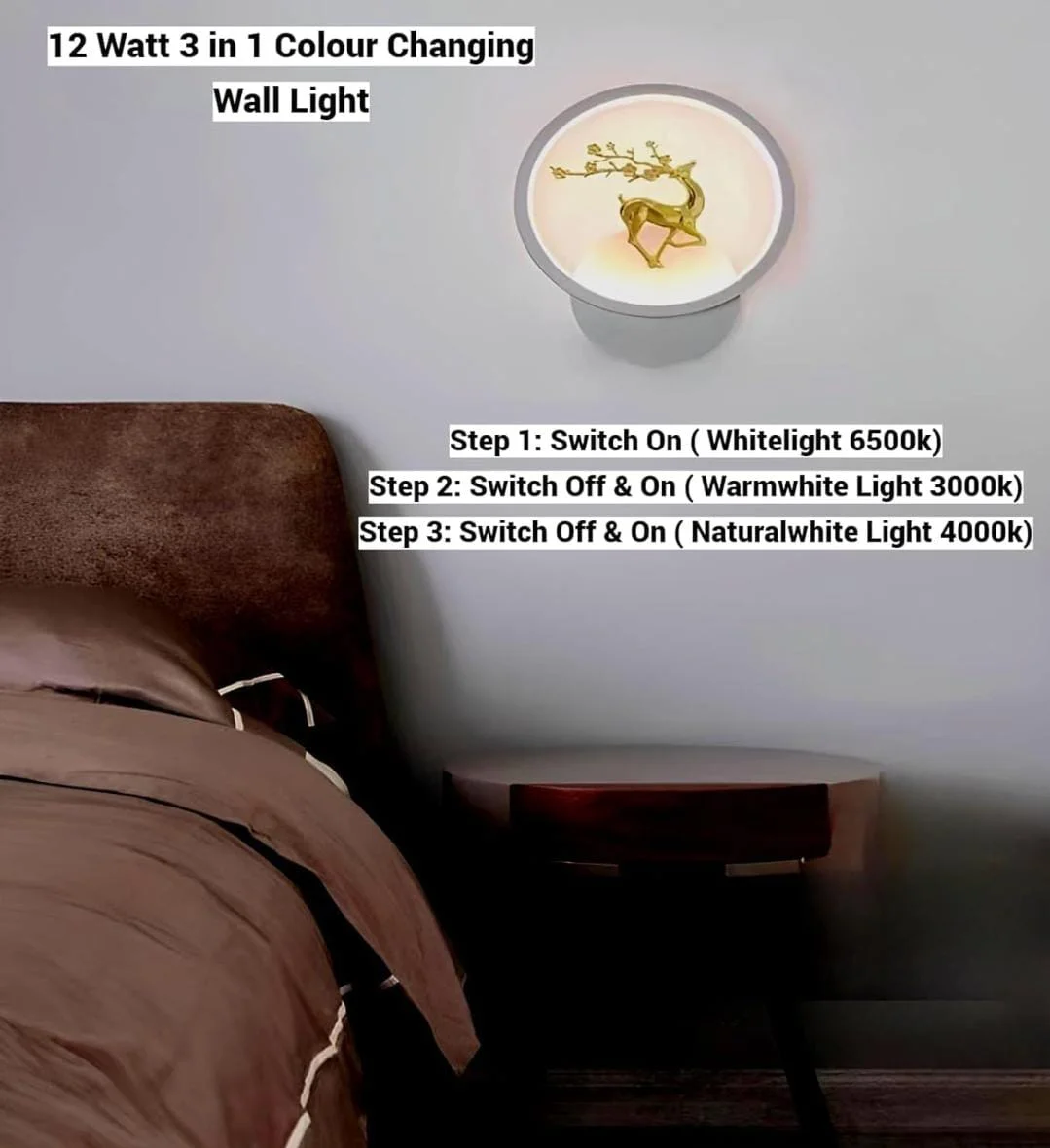 Introducing the 12W Round Black & Golden Rein Deer LED Wall Lamp, a fusion of style and functionality for your living spaces. Immerse yourself in the warm glow of versatile lighting with three color temperature settings – Warm White, Natural White, and Cold White. The lamp's chic round design, adorned with a black and golden reindeer motif, effortlessly complements modern aesthetics. Efficiency meets elegance with its 12W power rating, ensuring ample brightness while keeping energy consumption in check. Crafted with durability in mind, the high-quality construction promises long-lasting performance, making it a reliable addition to your home or office. Installation is a breeze, offering a hassle-free way to enhance your living room, bedroom, hallway, or office with both style and efficiency. The lamp's round design adds a contemporary touch, while the reindeer motif transforms it into a decorative statement piece for your walls. Versatility is key, seamlessly adapting to different settings and environments. Tailor the ambiance to your liking with the three color temperature options, accommodating various moods and activities. Elevate your interior decor with this LED wall lamp – a perfect marriage of form and function, designed to enhance both your lighting and living experience.