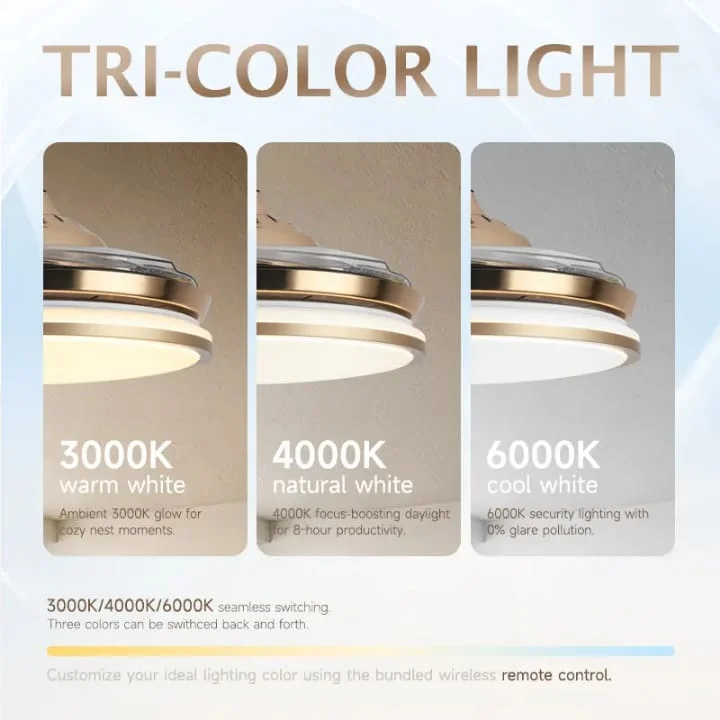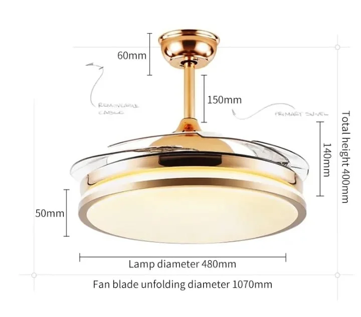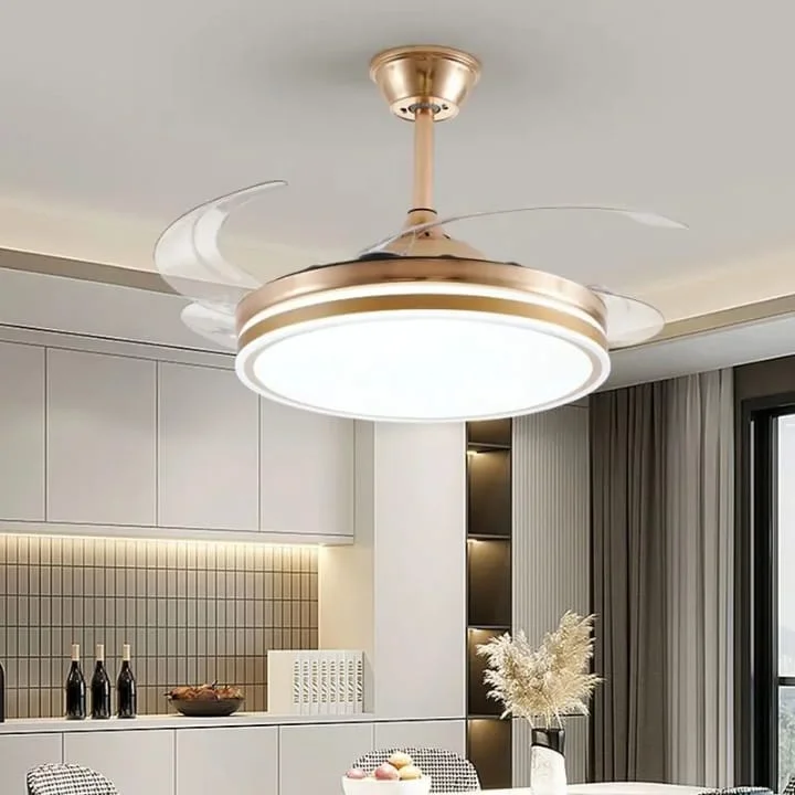 Elevate your living space with the Luxury Golden Ceiling Fan Chandelier. This stunning retractable fan lighting fixture features a sophisticated design with accents, adding a touch of luxury to any room. With three adjustable color lights, it seamlessly adapts to your desired ambiance. Ideal for living rooms, bedrooms, dining areas, entrances, showrooms, and cafés, this versatile chandelier combines style and functionality. The retractable blades provide efficient air circulation when extended and a sleek, unobtrusive look when retracted. Enjoy a blend of elegance and practicality with this exquisite ceiling fan chandelier.