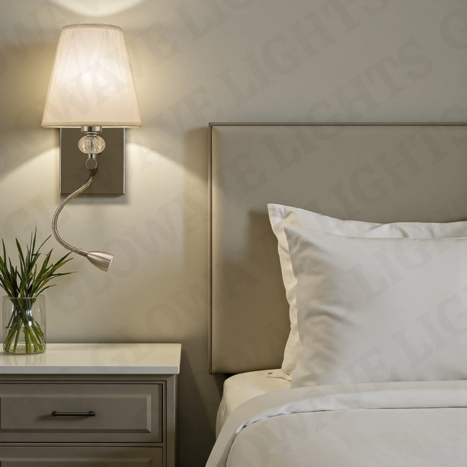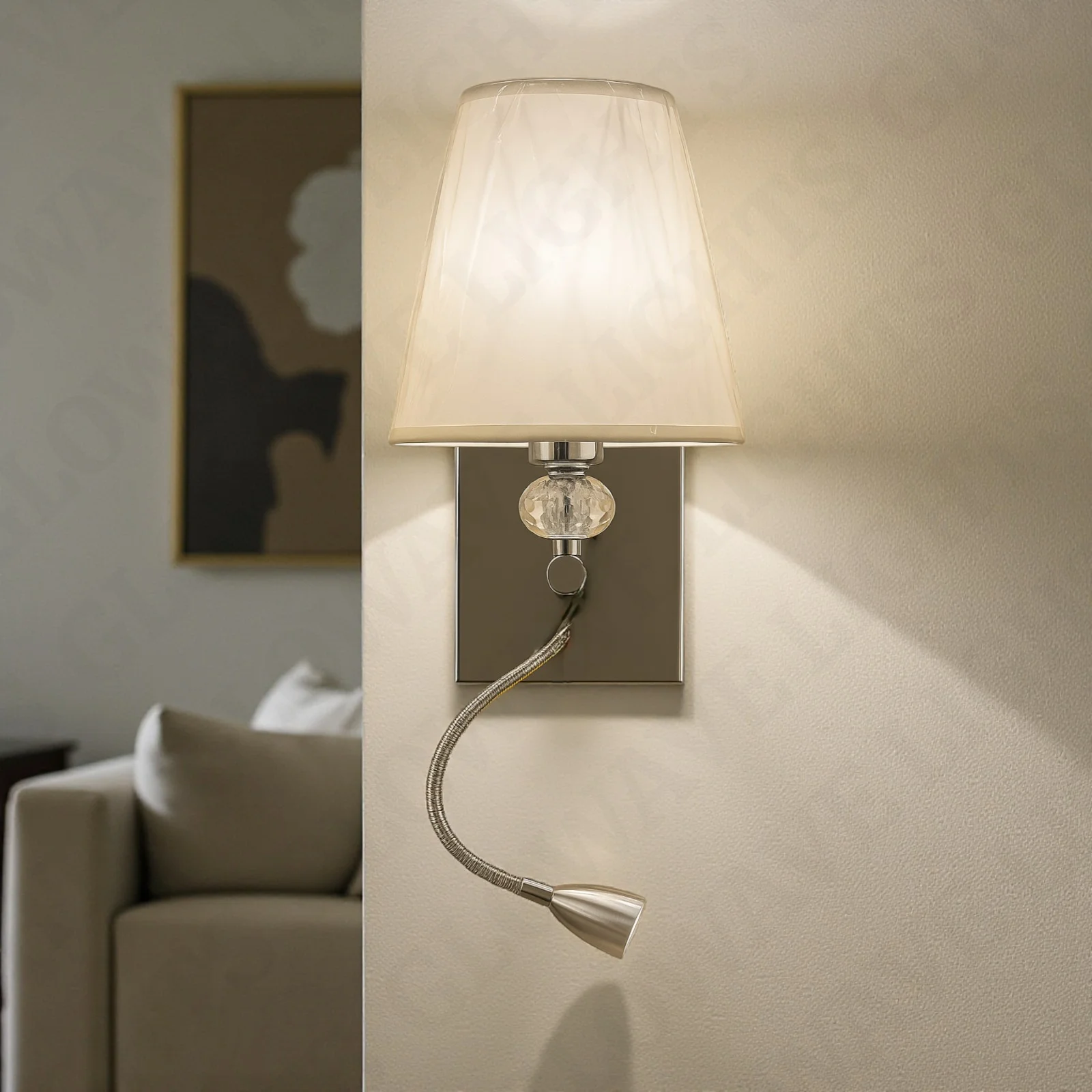 Chrome Body Fabric Lampshade Wall Lamp with Adjustable LED Spot Light - Warm White