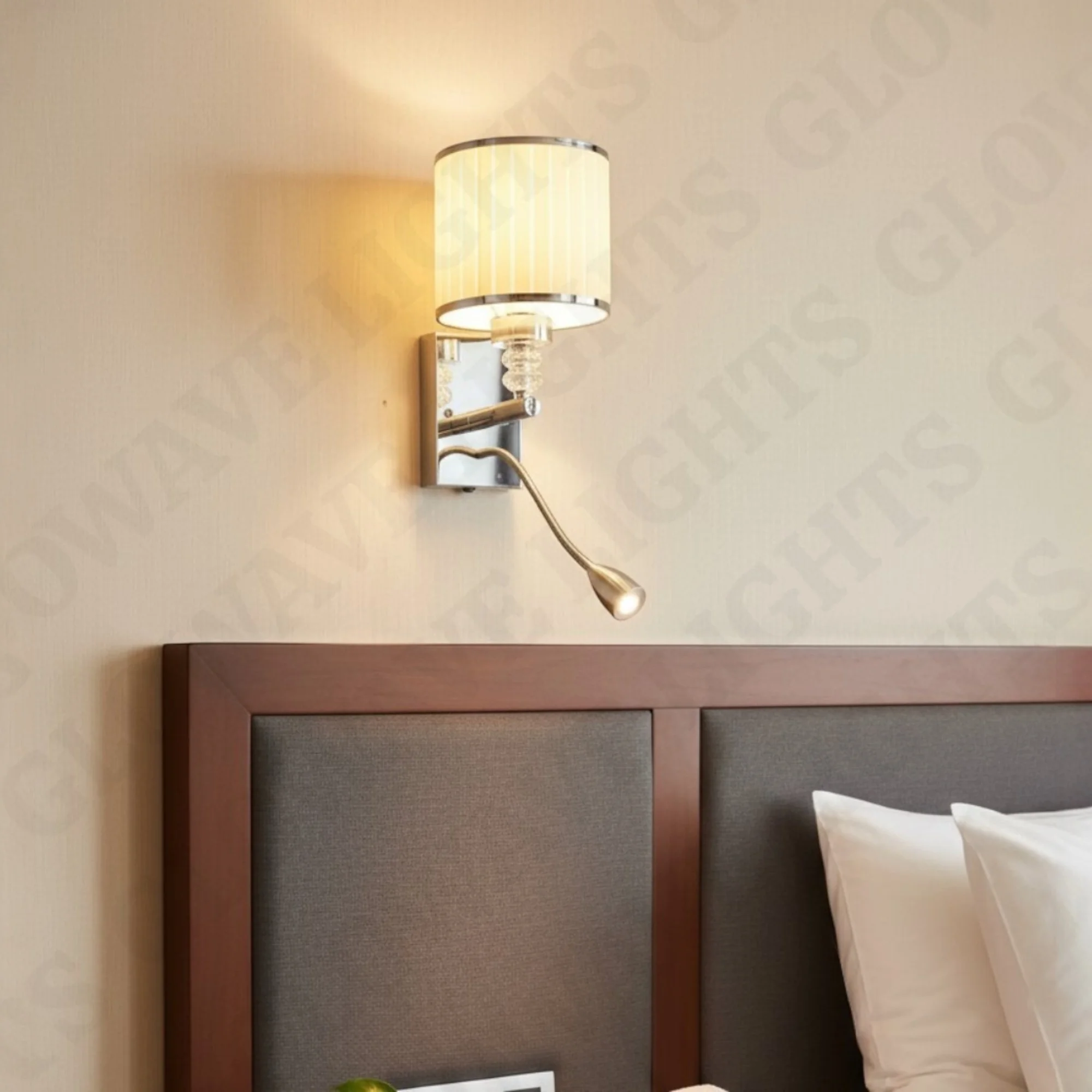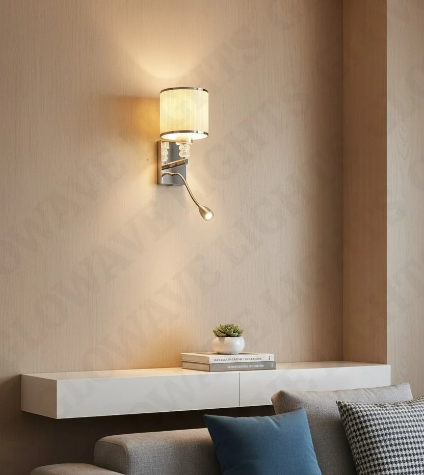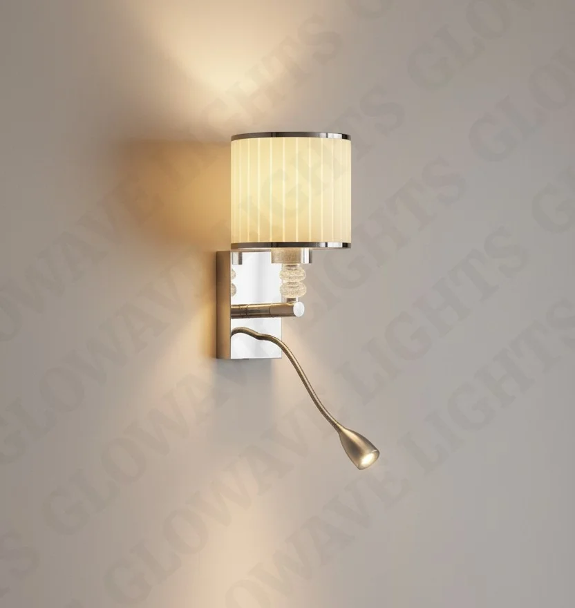 Chrome Body Fabric Lampshade Wall Lamp with Adjustable LED Spot Light - Warm White
