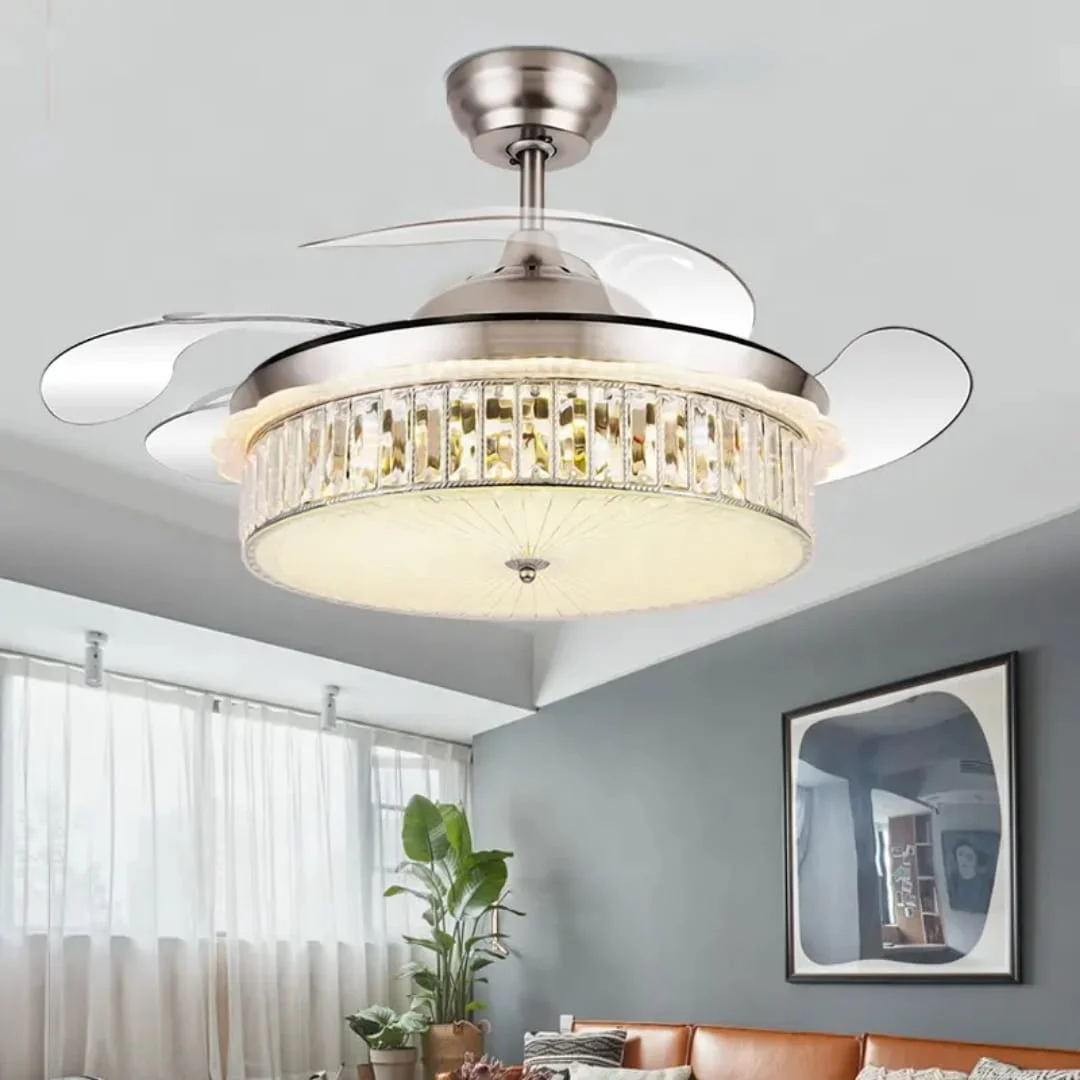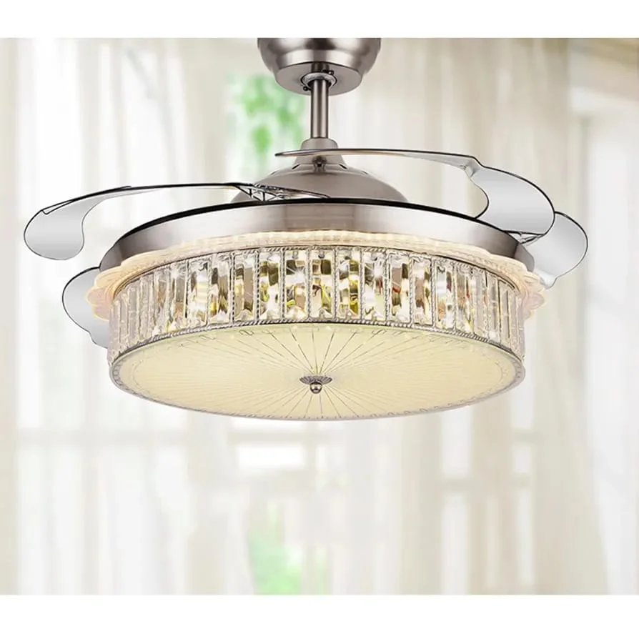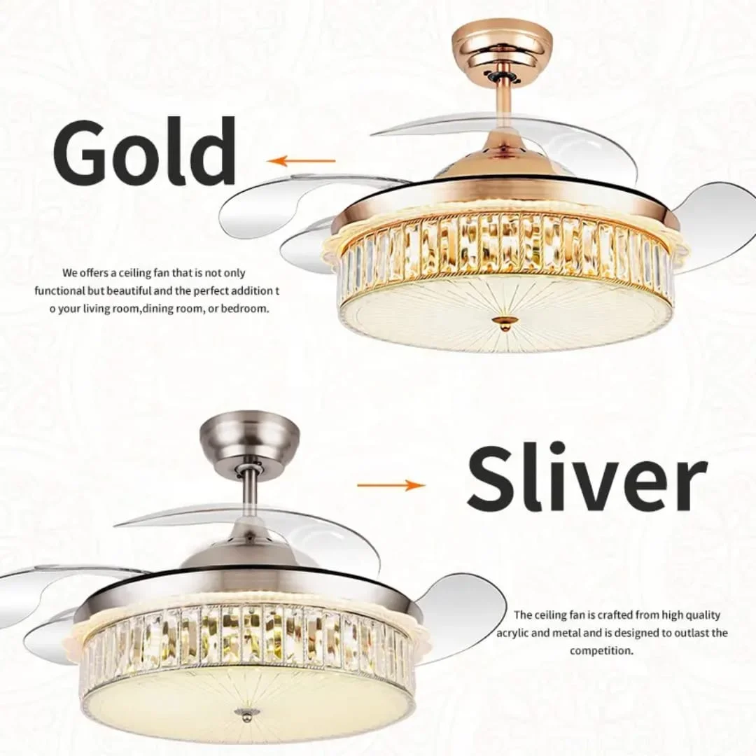 Elevate your living space with the 42-Inch Luxury Chrome Crystal Ceiling Fan Chandelier. This stunning retractable fan lighting fixture features a sophisticated design with sparkling crystal accents, adding a touch of luxury to any room. With three adjustable color lights, it seamlessly adapts to your desired ambiance. Ideal for living rooms, bedrooms, dining areas, entrances, showrooms, and cafés, this versatile chandelier combines style and functionality. The retractable blades provide efficient air circulation when extended and a sleek, unobtrusive look when retracted. Enjoy a blend of elegance and practicality with this exquisite ceiling fan chandelier.