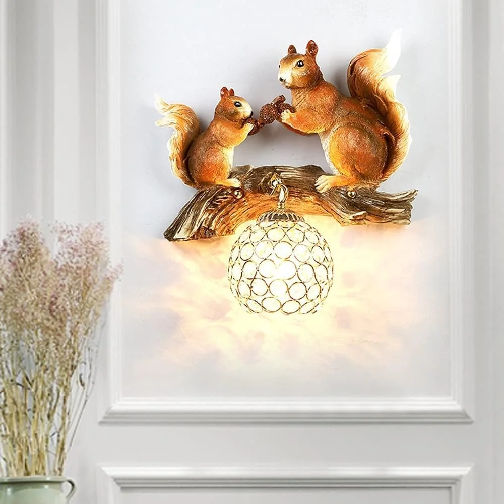 Cute Resin Brown Squirrels Holding Globe Wall Lamp - Warm White