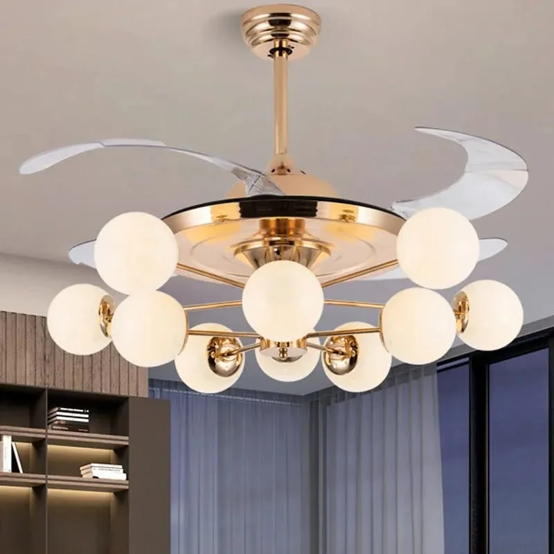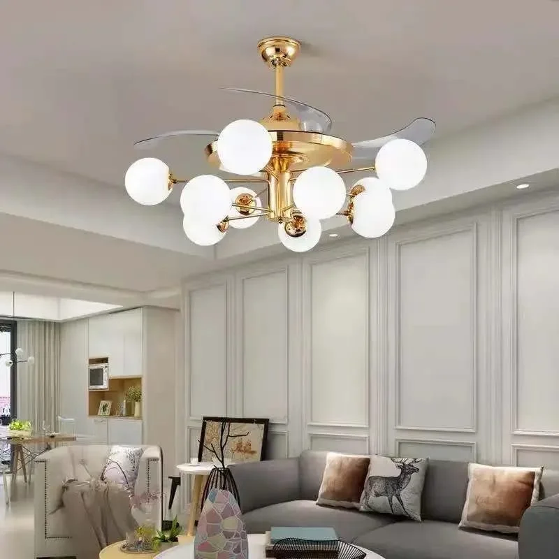 Elevate your living space with the Luxury Golden Frosted Glass Ceiling Fan Chandelier. This stunning retractable fan lighting fixture features a sophisticated design with Frosted Balls accents, adding a touch of luxury to any room. With three adjustable color lights, it seamlessly adapts to your desired ambiance. Ideal for living rooms, bedrooms, dining areas, entrances, showrooms, and cafés, this versatile chandelier combines style and functionality. The retractable blades provide efficient air circulation when extended and a sleek, unobtrusive look when retracted. Enjoy a blend of elegance and practicality with this exquisite ceiling fan chandelier.