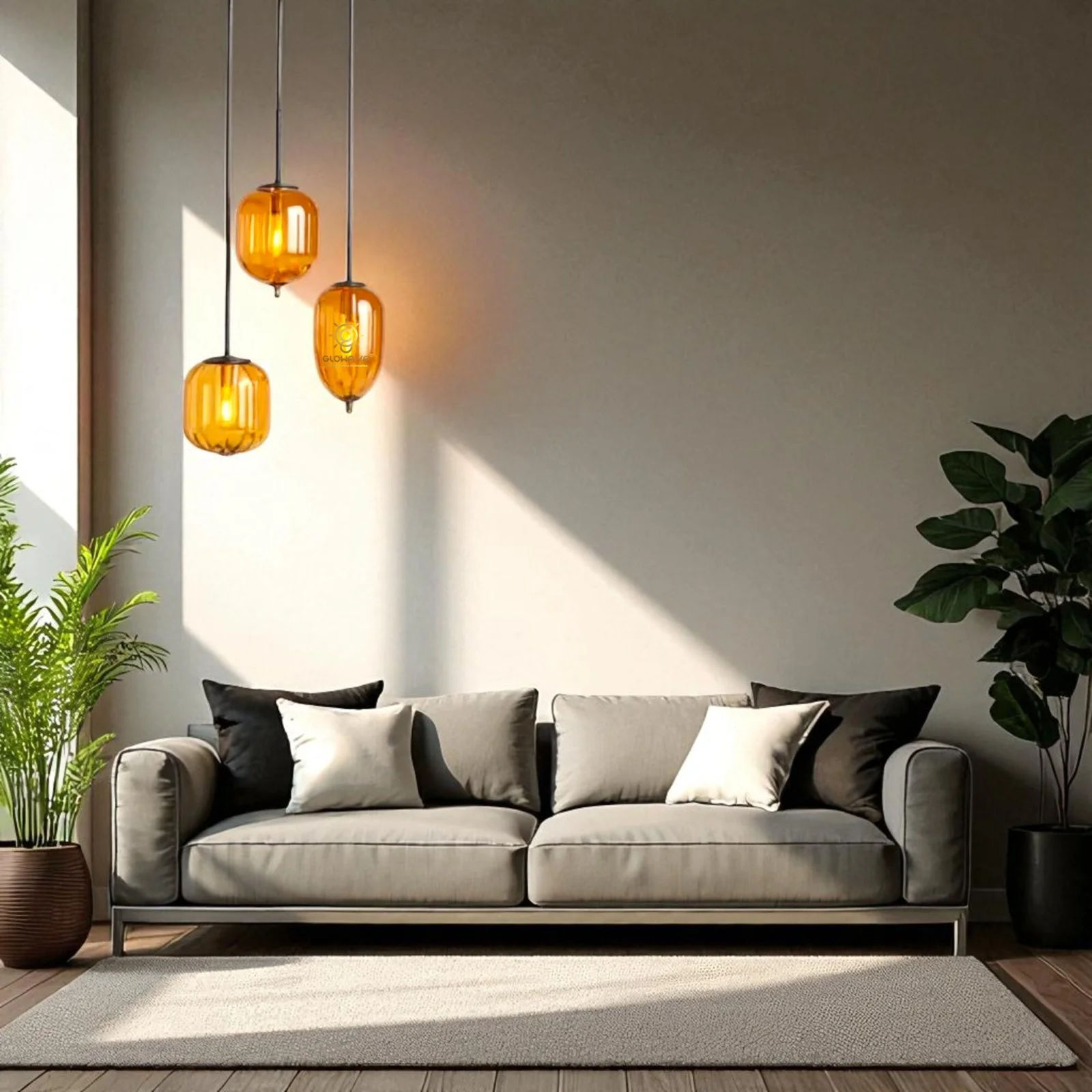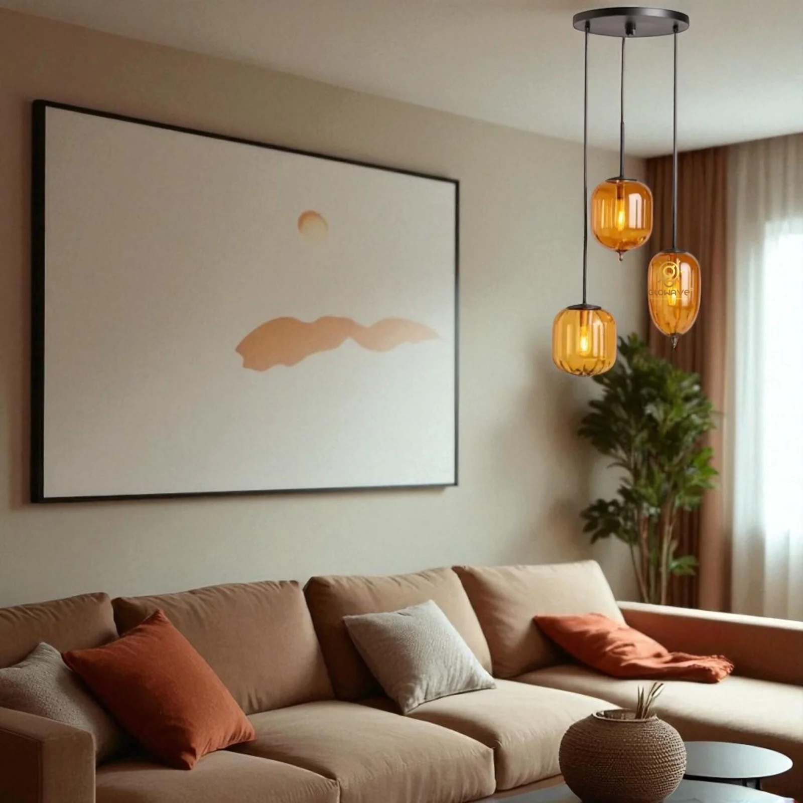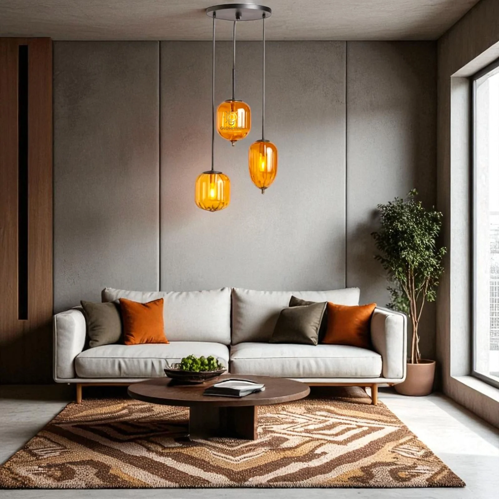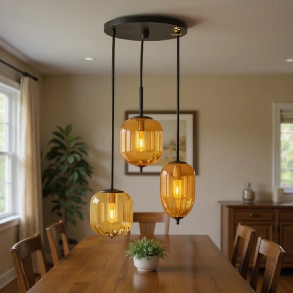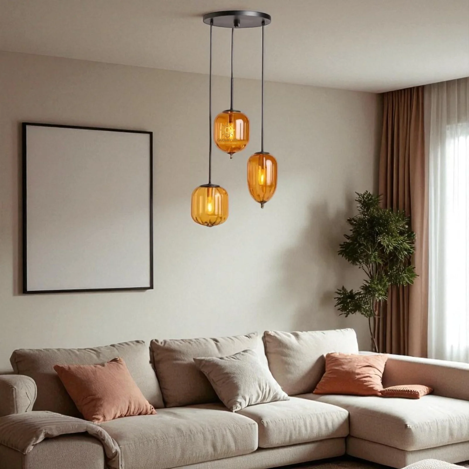 European Golden Amber Glass Set of 3 Pendant Hanging Light - Warm White