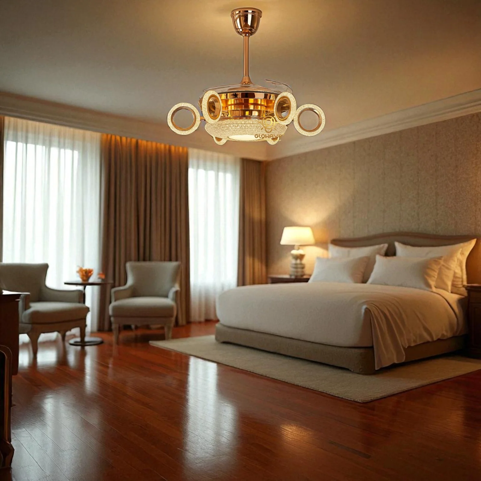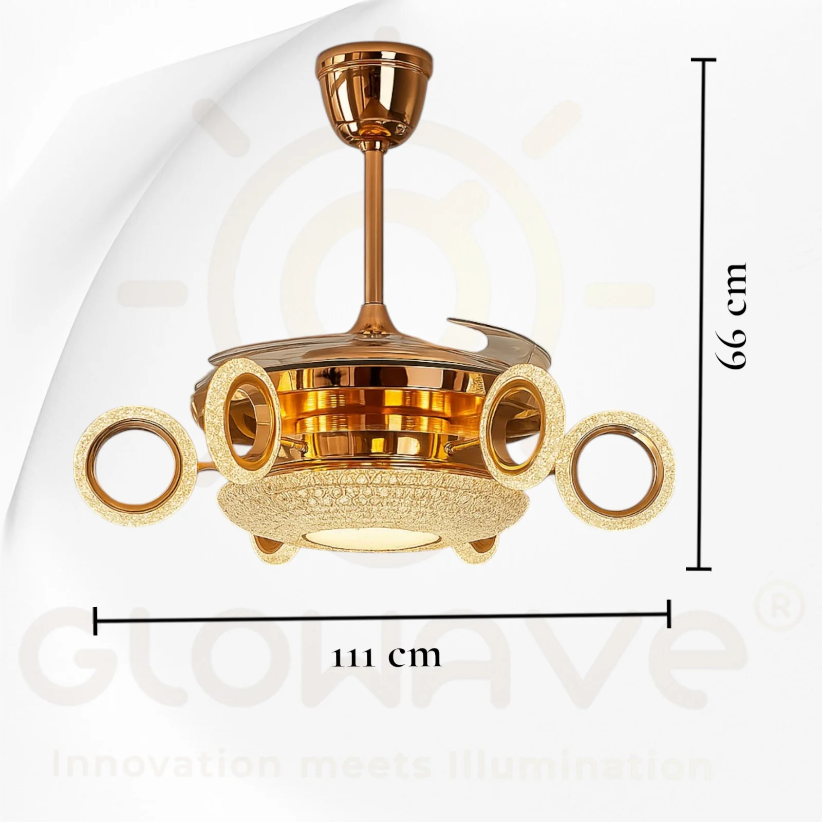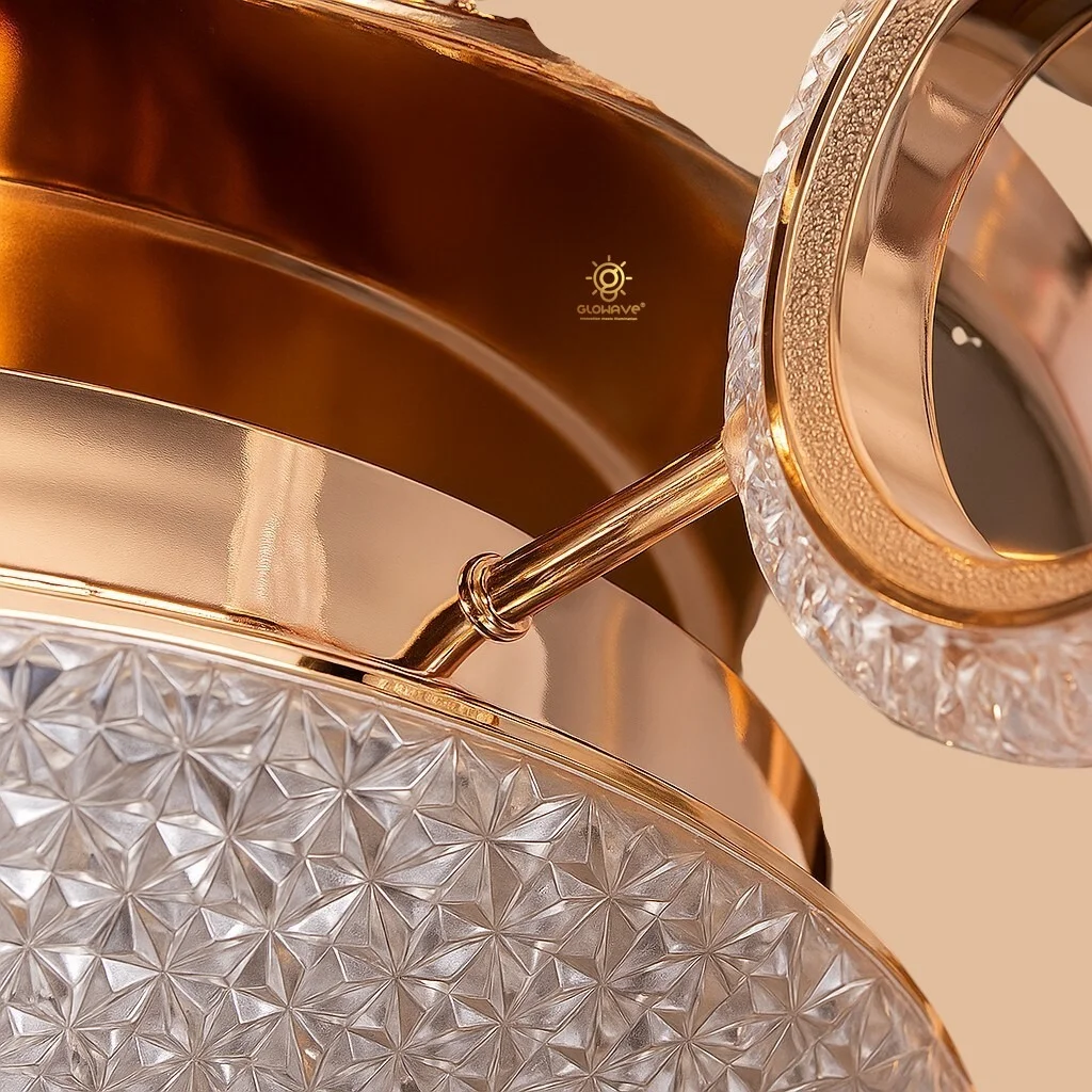 - Metal body with 6 acrylic rings shape light attached , crystal Bottom and ABS fan blades with copper binding motor chandelier fan