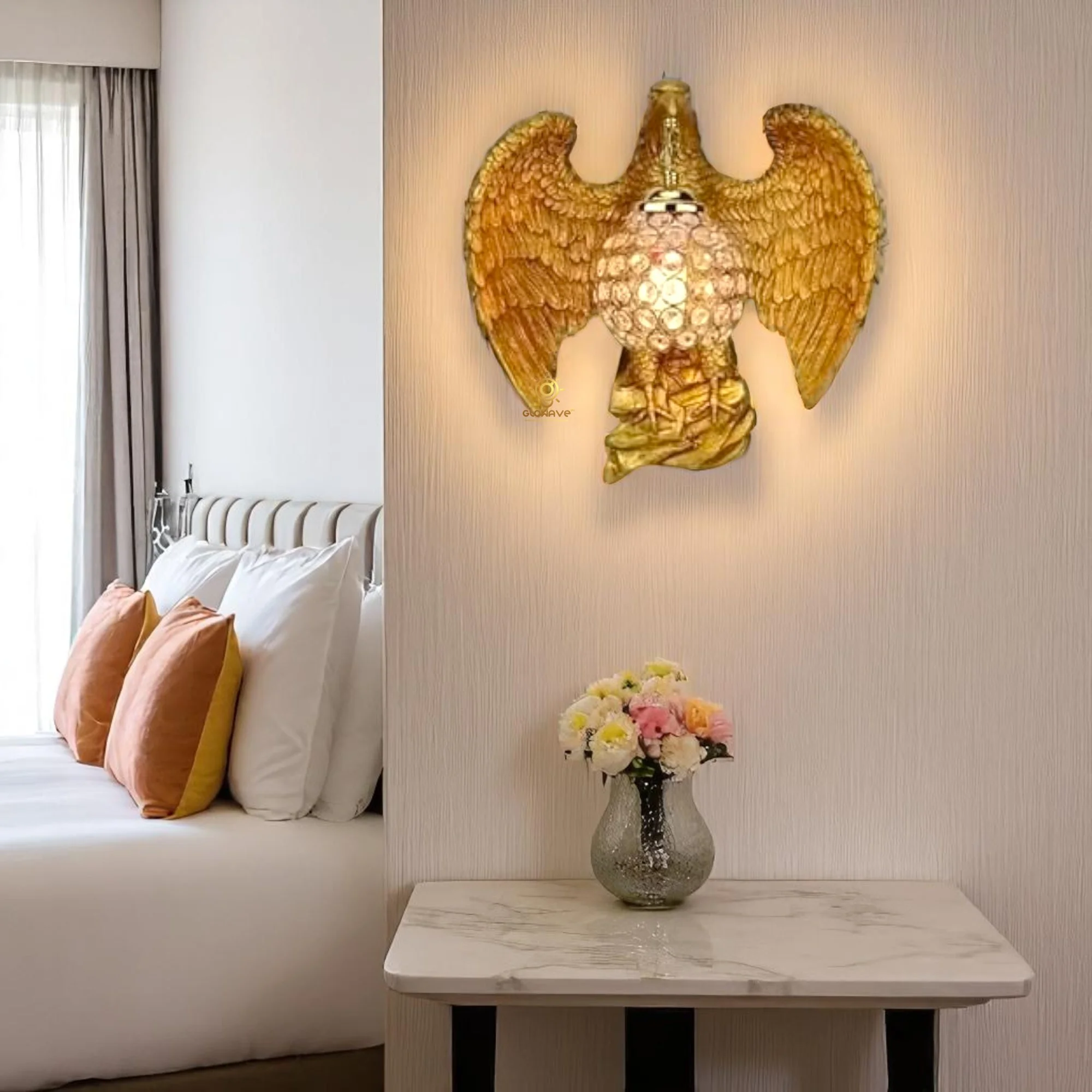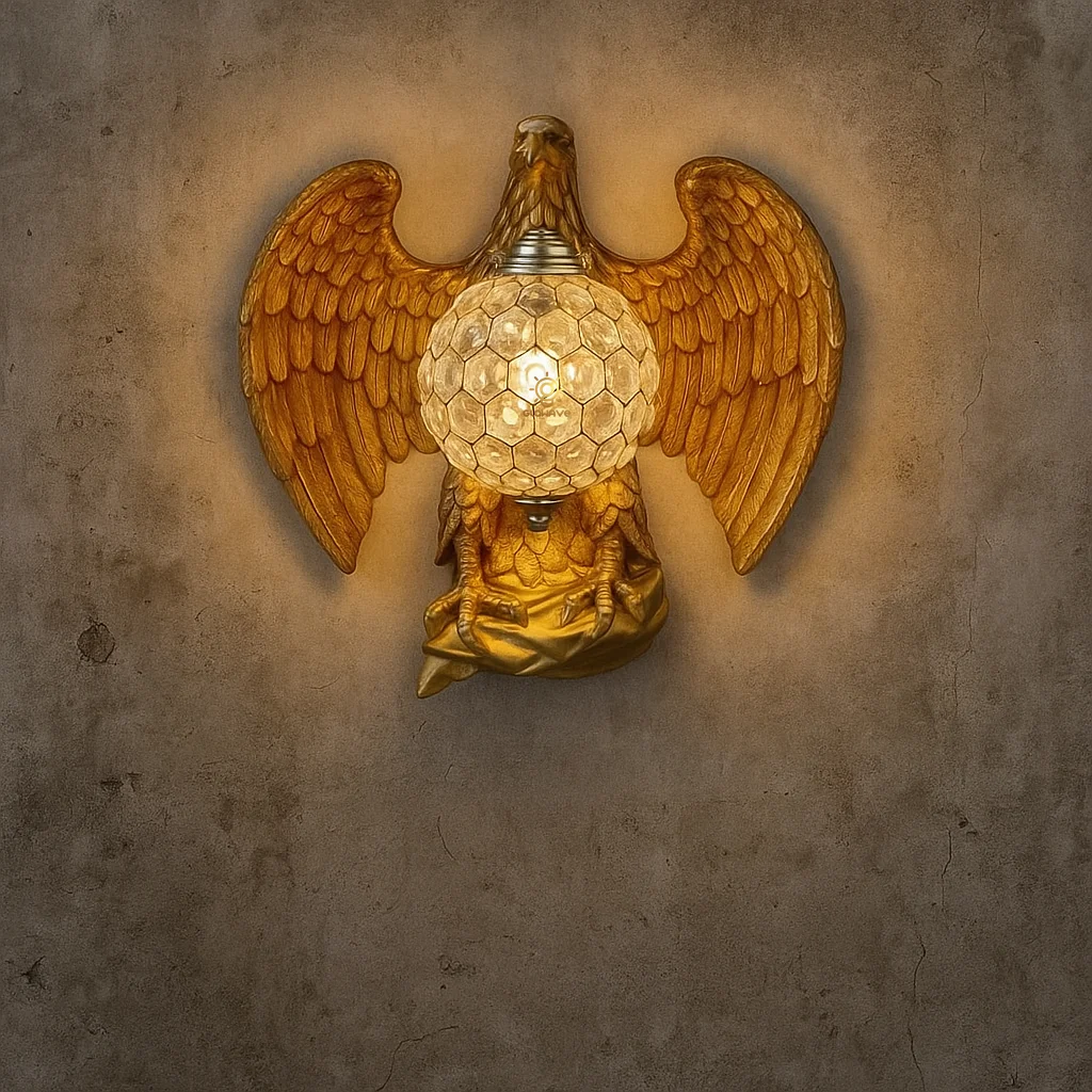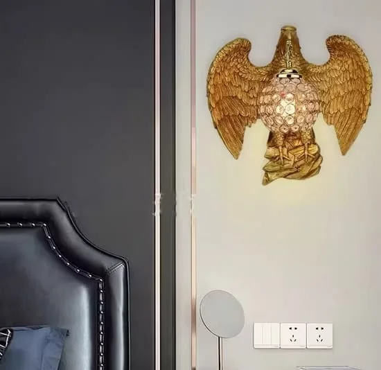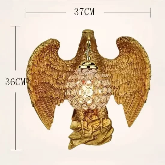 Illuminate your space with the Gold Eagle Metal Golden Wall Lamp, perfect for living rooms, bedrooms, and bedsides. This exquisite warm white lamp features a majestic eagledesign with big horns, adding a touch of luxury and elegance to any decor. Crafted from high-quality metal with a stunning golden finish, it provides a warm, inviting glow that enhances the ambiance of your home. Ideal for those seeking a blend of sophistication and functionality, this wall lamp is a statement piece that elevates your interior design.