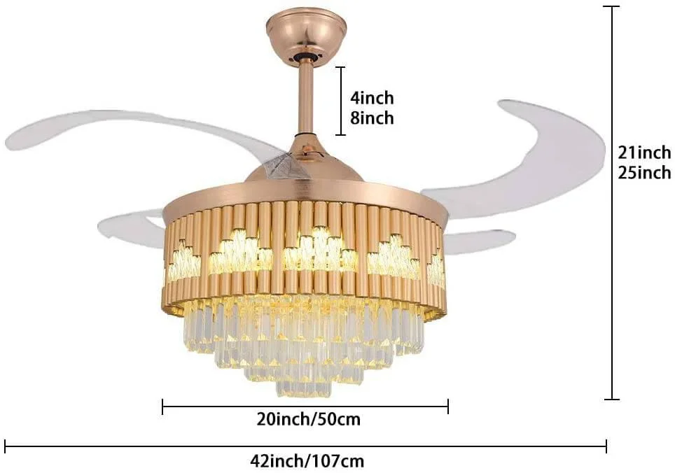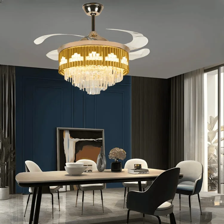Elevate your living space with the 42-Inch Golden Acrylic Ceiling Fan Chandelier. This stunning retractable fan lighting fixture features a sophisticated design with sparkling accents, adding a touch of luxury to any room. With three adjustable color lights, it seamlessly adapts to your desired ambiance. Ideal for living rooms, bedrooms, dining areas, entrances, showrooms, and cafés, this versatile chandelier combines style and functionality. The retractable blades provide efficient air circulation when extended and a sleek, unobtrusive look when retracted. Enjoy a blend of elegance and practicality with this exquisite ceiling fan chandelier.