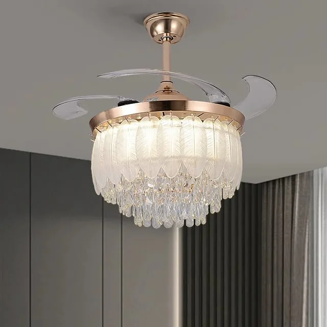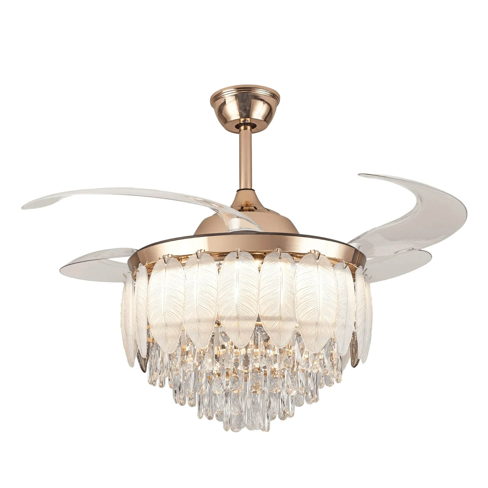 Golden 42" Crystal Feather Chandelier Fan with 4 Transparent Retractable ABS Fan Blades with Remote Control - Tricolour T8255