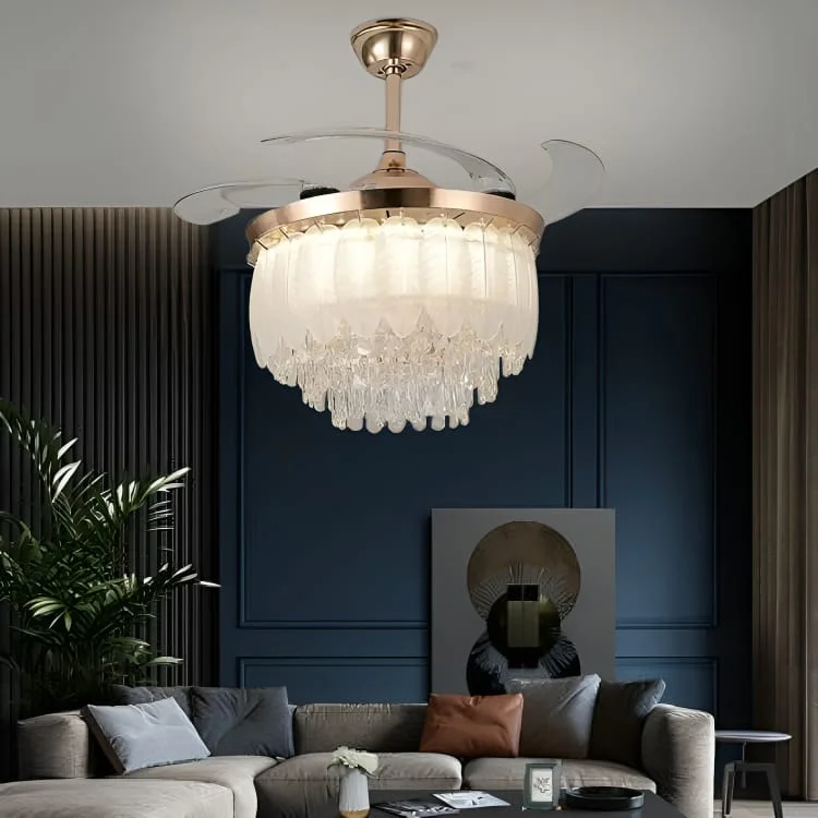 Elevate your living space with the 42-Inch Golden Acrylic Ceiling Fan Chandelier. This stunning retractable fan lighting fixture features a sophisticated design with sparkling accents, adding a touch of luxury to any room. With three adjustable color lights, it seamlessly adapts to your desired ambiance. Ideal for living rooms, bedrooms, dining areas, entrances, showrooms, and cafés, this versatile chandelier combines style and functionality. The retractable blades provide efficient air circulation when extended and a sleek, unobtrusive look when retracted. Enjoy a blend of elegance and practicality with this exquisite ceiling fan chandelier.