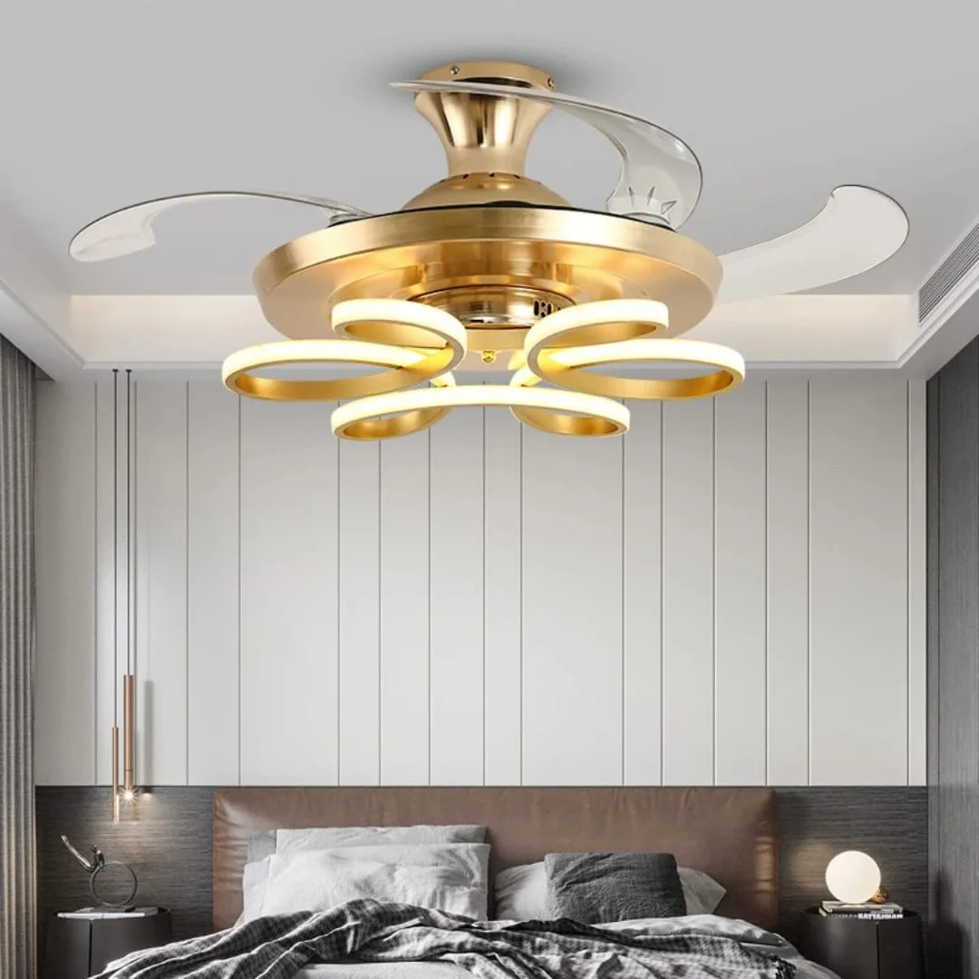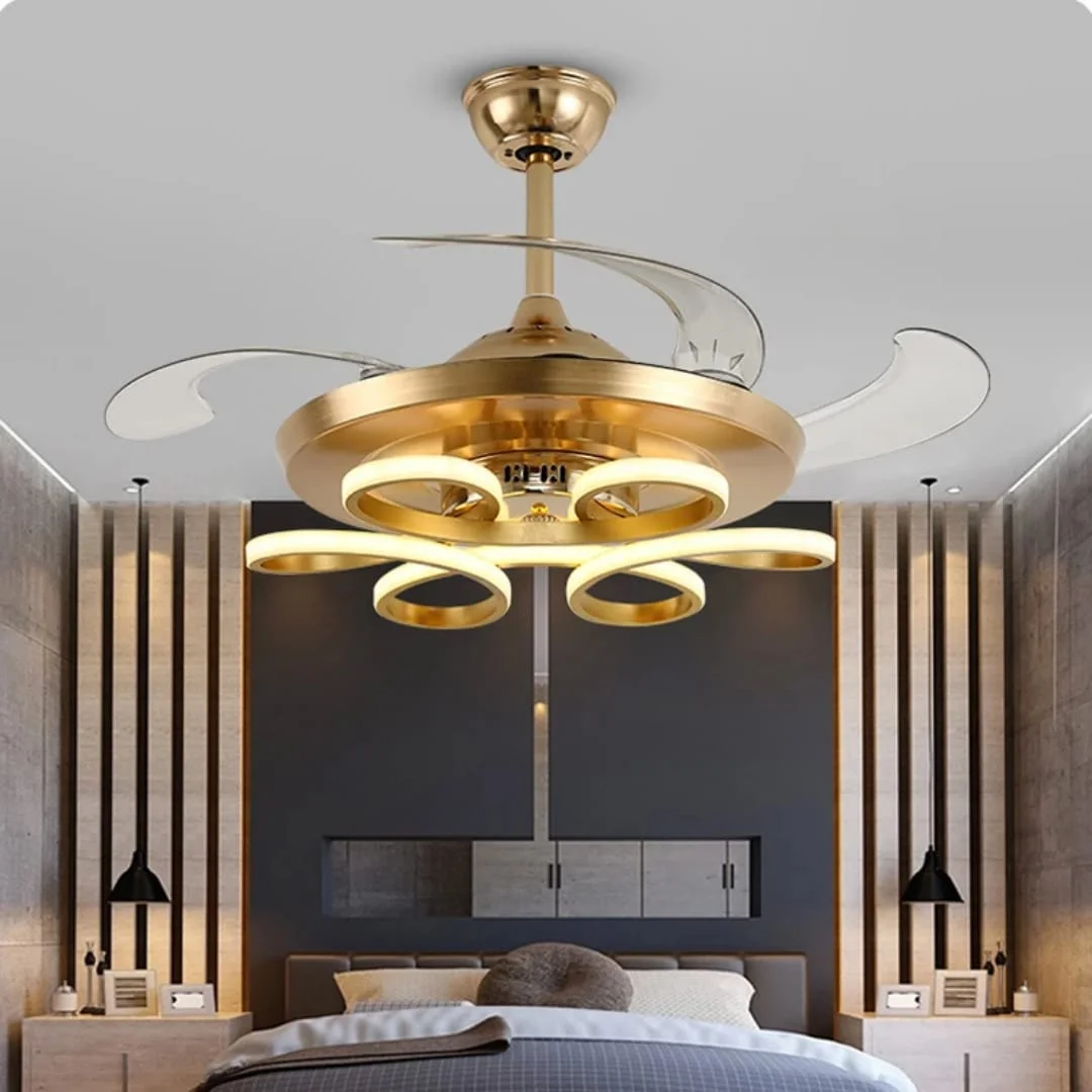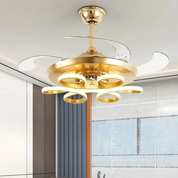 Elevate your living space with the Luxury Golden Acrylic Ceiling Fan Chandelier. This stunning retractable fan lighting fixture features a sophisticated design with sparkling rings accents, adding a touch of luxury to any room. With three adjustable color lights, it seamlessly adapts to your desired ambiance. Ideal for living rooms, bedrooms, dining areas, entrances, showrooms, and cafés, this versatile chandelier combines style and functionality. The retractable blades provide efficient air circulation when extended and a sleek, unobtrusive look when retracted. Enjoy a blend of elegance and practicality with this exquisite ceiling fan chandelier.