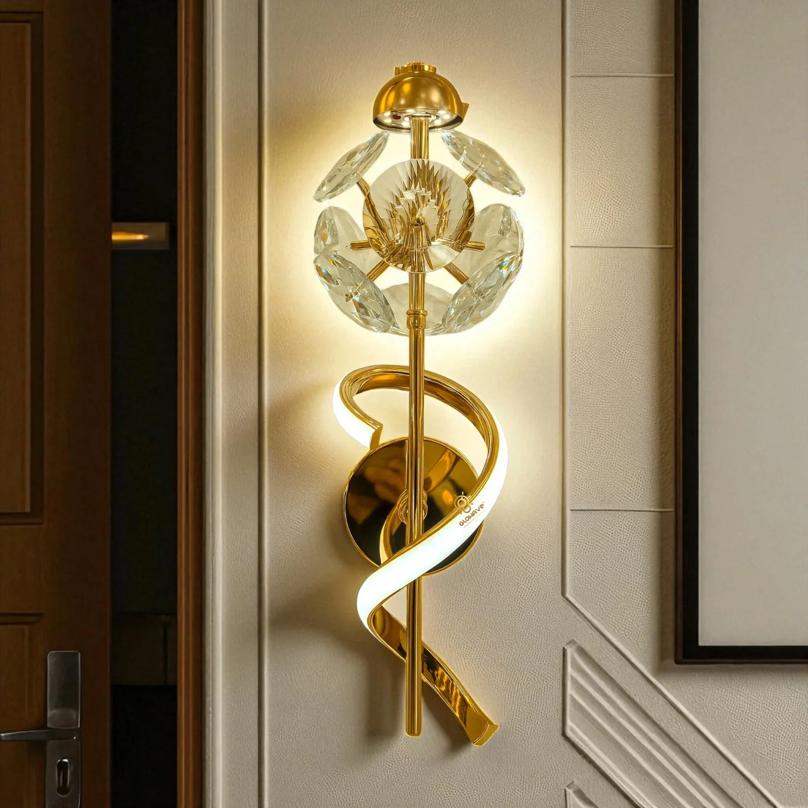 Elevate your living space with the Modern Golden Finish Flower Round LED Wall Lamp. This elegant lighting fixture, perfect for your living room, bedroom, or bedside, features a sleek golden finish and contemporary oval design. It provides a warm white, White and natural white glow that creates a cozy ambiance.