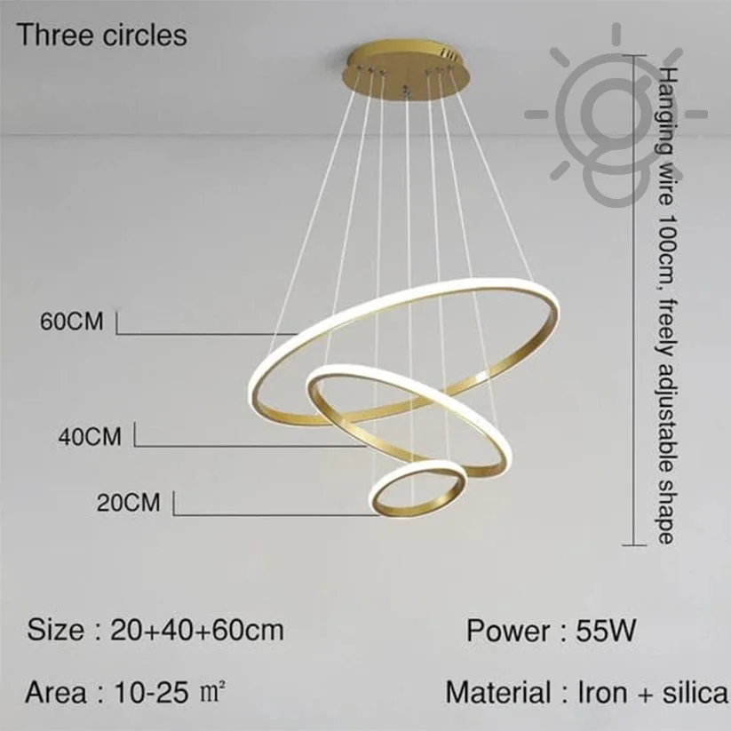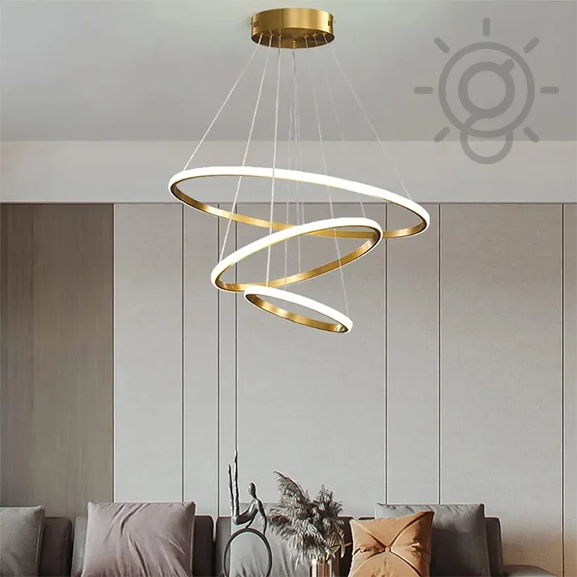 Elevate your space with the Modern LED Metal 3 Rings Golden Pendant Chandelier Light. Perfect for kitchens, cafes, and dining bars, this stunning fixture offers tricolour lighting options: Warm White, White, and Natural White. The sleek golden metal design adds a touch of elegance and modernity, making it a versatile and stylish choice for any setting. Ideal for contemporary interiors, this chandelier enhances ambiance while providing efficient LED lighting. Transform your space with this exquisite hanging light today!