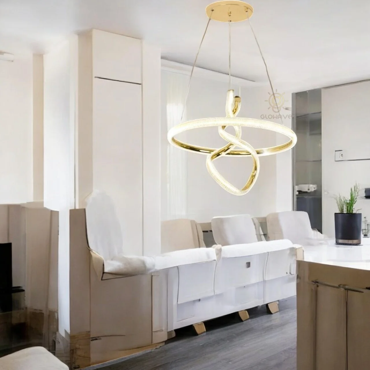 Enhance your living space with the Glowave Creative Golden LED Round Bedside Pendant Hanging Light Ceiling Lamp Lighting Fixture. This elegant, modern pendant lamp features a stunning golden finish and versatile tricolour light settings, offering White, Warm White, and Natural White options to suit any ambiance. Perfect for bedrooms, living rooms, or dining areas, this stylish lighting fixture combines functionality with aesthetic appeal. Illuminate your home with the Glowave Creative Pendant Light and enjoy the perfect blend of sophistication and contemporary design. Upgrade your décor with this chic, energy-efficient lighting solution today.