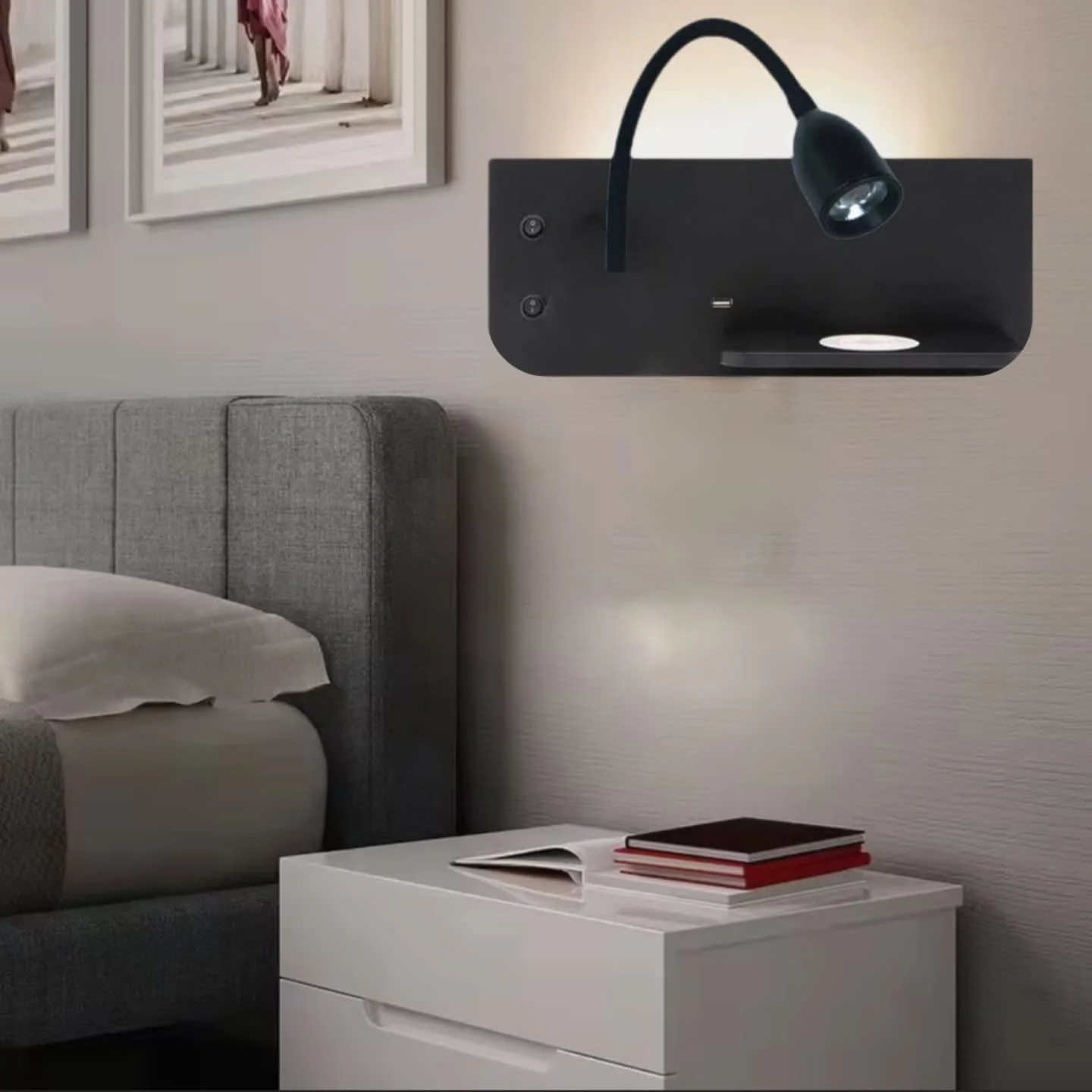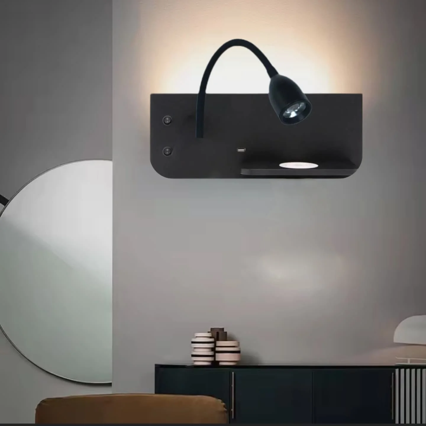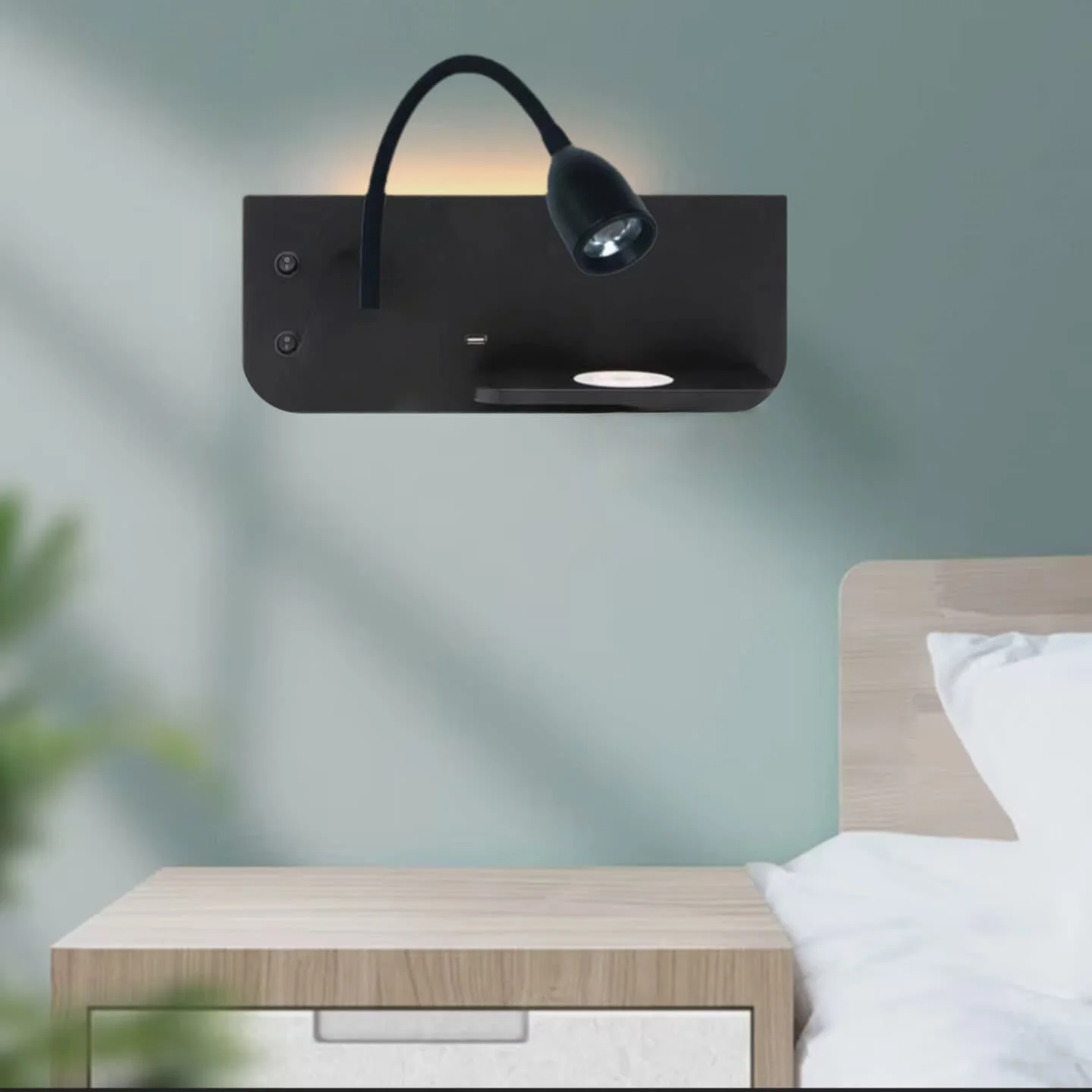 The Modern Wall Spot Light with Gooseneck Adjustable Head is the perfect blend of style, functionality, and convenience for any modern bedroom or living space. Designed for ultimate flexibility, this sleek, wireless light features an adjustable gooseneck arm, allowing you to direct the light exactly where you need it. The warm white LED light provides a soothing, cozy ambiance perfect for reading, relaxing, or winding down at the end of the day. With a built-in USB charging port, you can easily charge your phone or other devices right next to your bed or sofa. Its minimalist design fits seamlessly into any decor, offering both elegance and practicality.