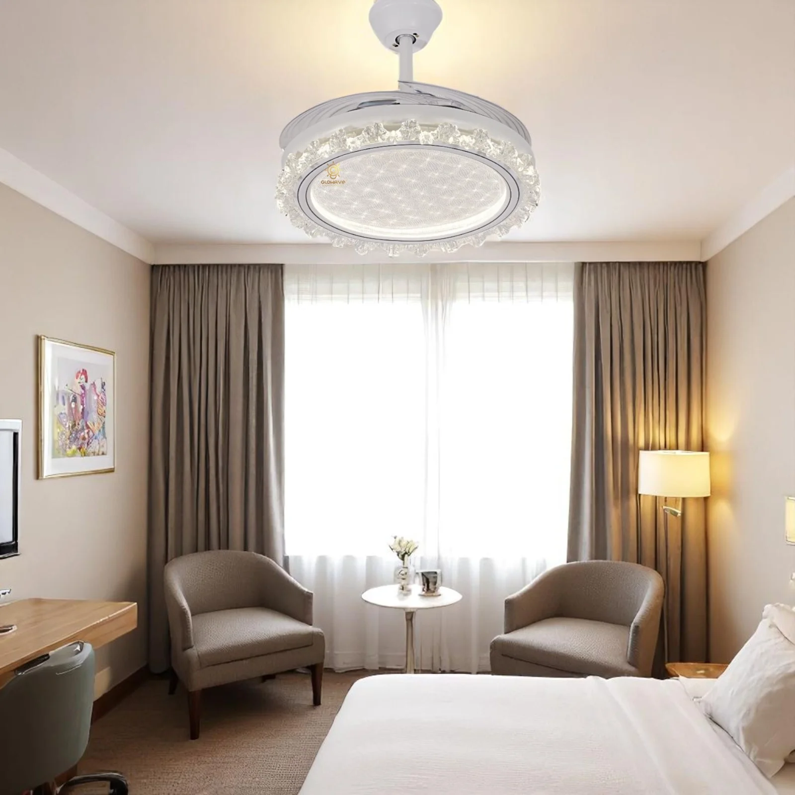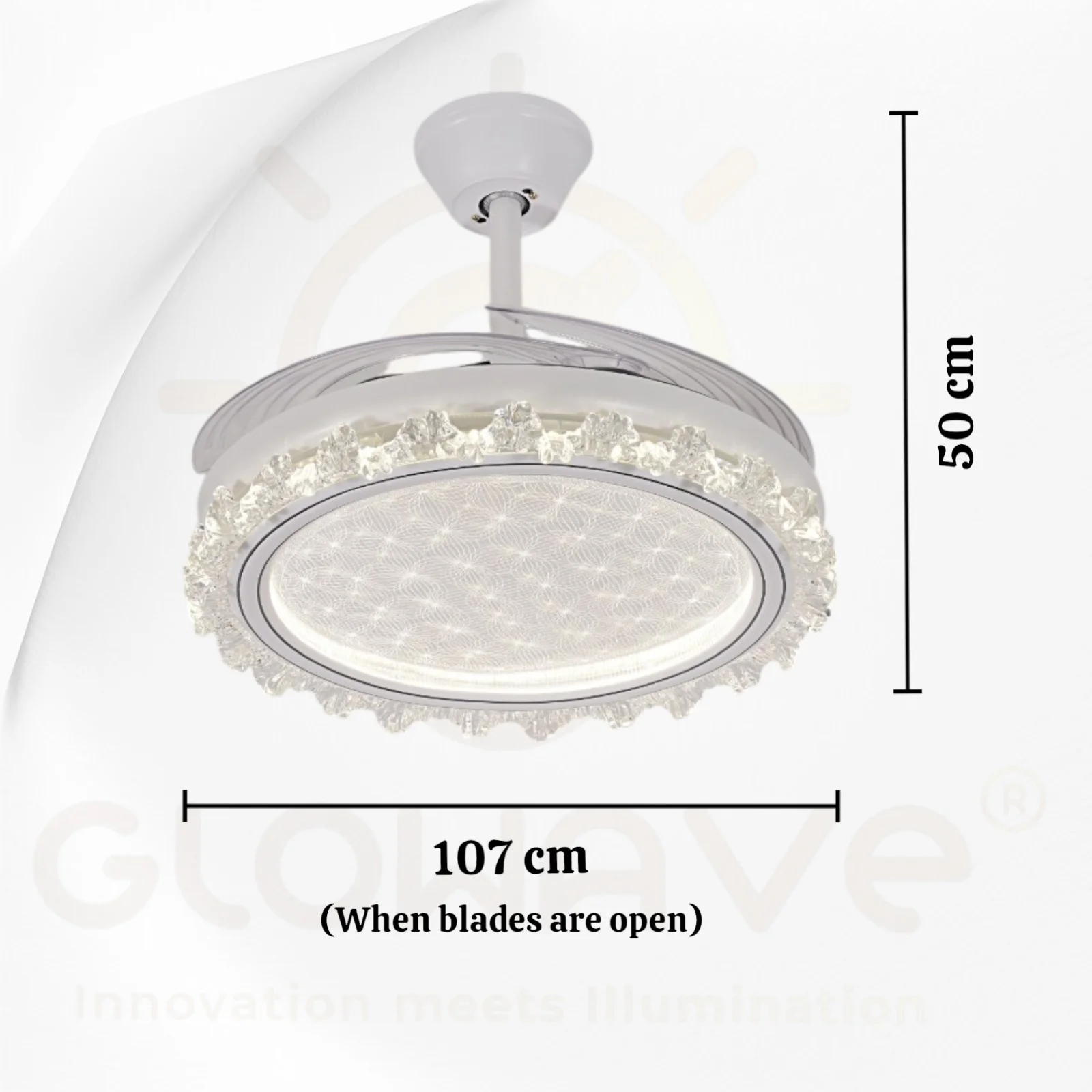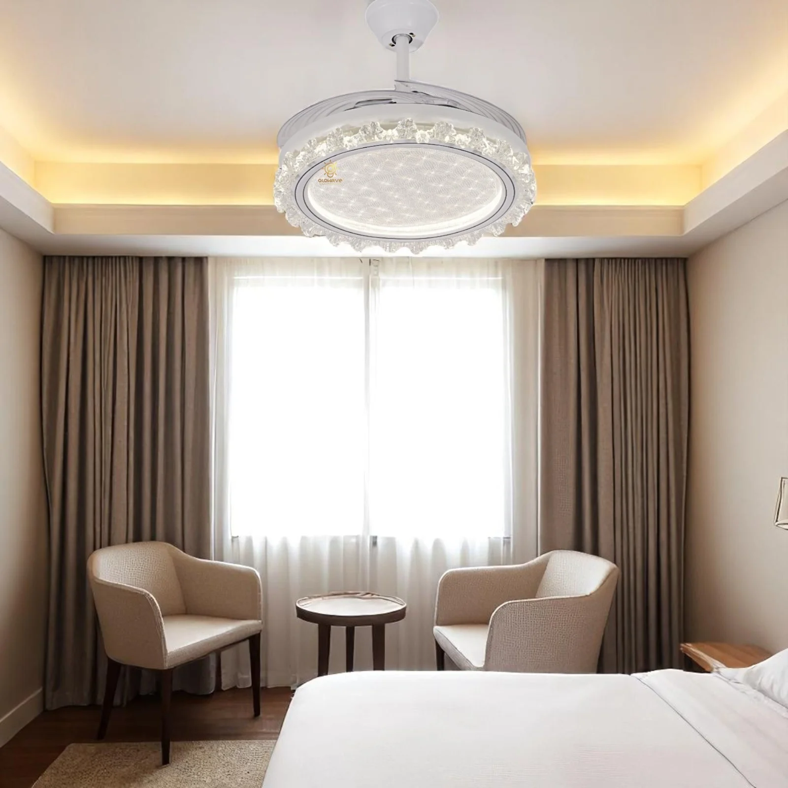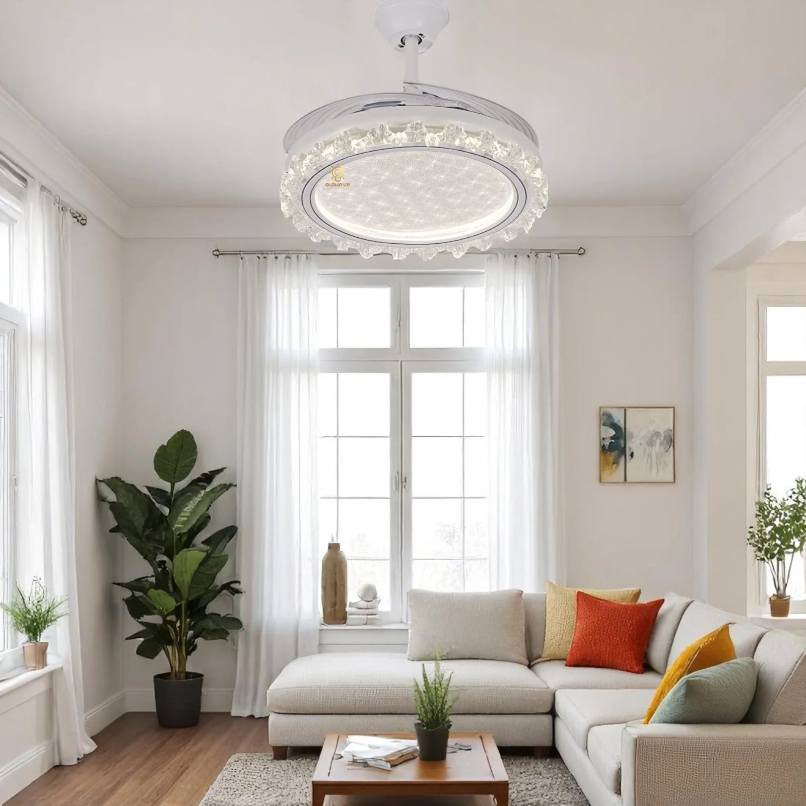Elevate your living space with the Luxury White Ceiling Fan Chandelier. This stunning retractable fan lighting fixture features a sophisticated design with accents, adding a touch of luxury to any room. With three adjustable color lights, it seamlessly adapts to your desired ambiance. Ideal for living rooms, bedrooms, dining areas, entrances, showrooms, and cafés, this versatile chandelier combines style and functionality. The retractable blades provide efficient air circulation when extended and a sleek, unobtrusive look when retracted. Enjoy a blend of elegance and practicality with this exquisite ceiling fan chandelier.