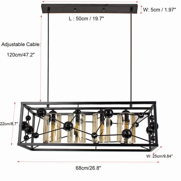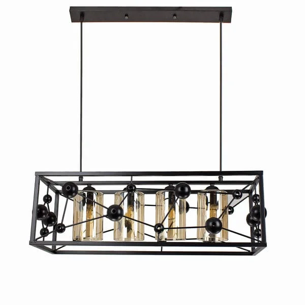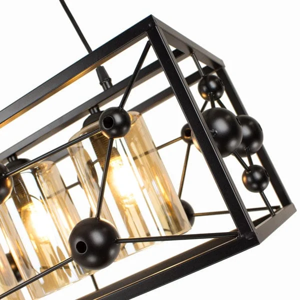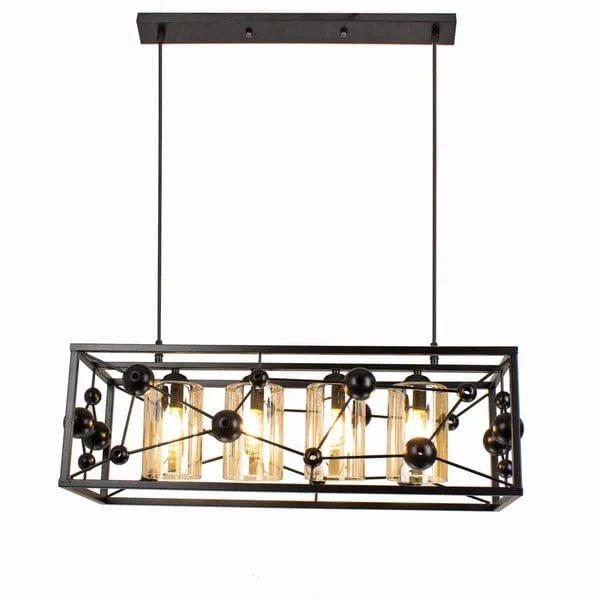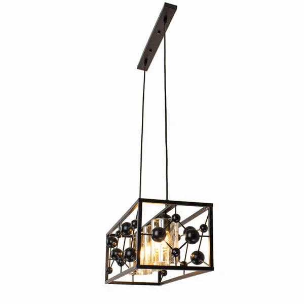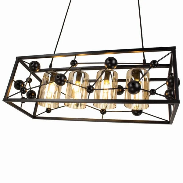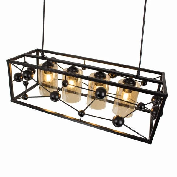 Elevate the ambiance of your kitchen island or dining area with the Modern Black Metal Body 4 Glass Light Rectangle Pendant Chandelier. With a striking molecule structure design, this chandelier fuses contemporary aesthetics with functional lighting. The sleek black metal frame provides a stylish contrast to the four warm white glass globes, creating a sophisticated centerpiece that casts a gentle, inviting glow. Perfect for modern and minimalist spaces, this light fixture enhances the decor while delivering ample illumination. Whether you're entertaining guests or enjoying a quiet dinner, this chandelier is sure to set the perfect mood.