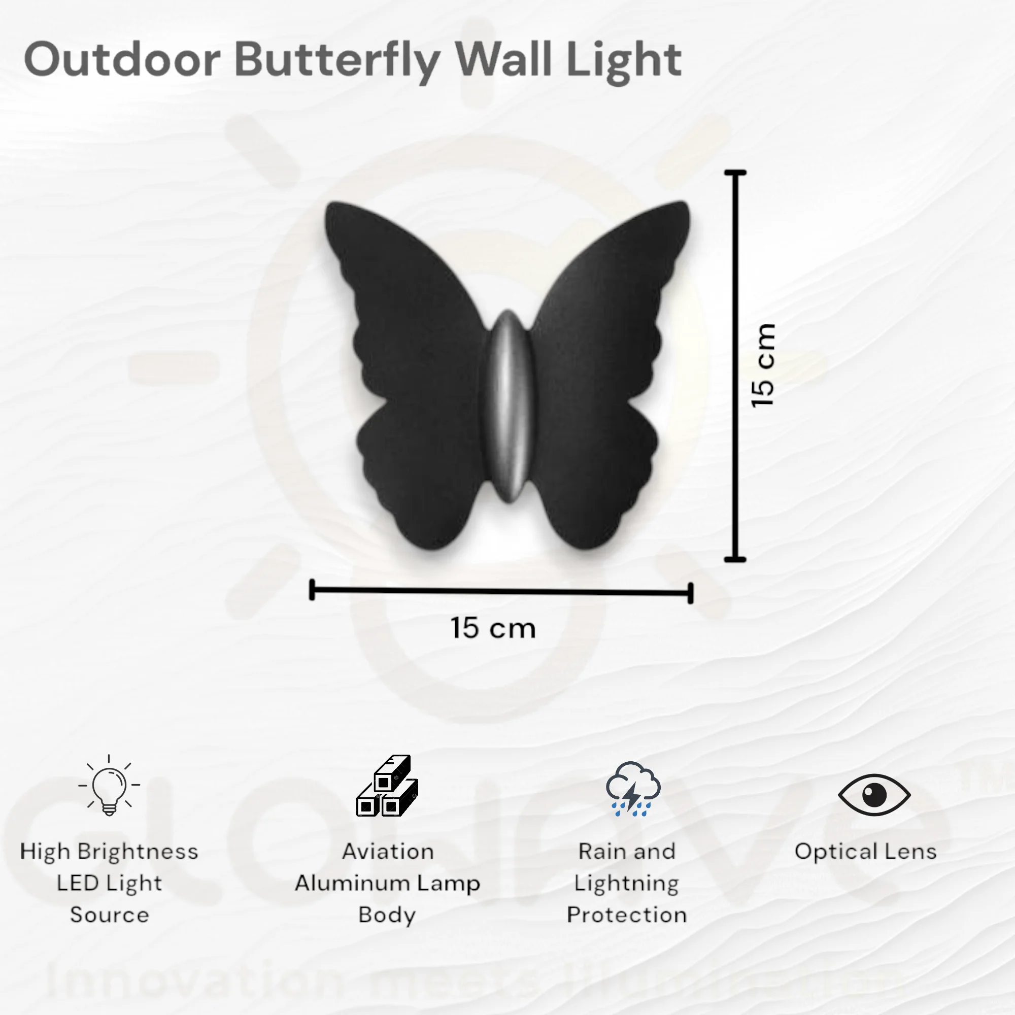 Introducing the LED Indoor/Outdoor Butterfly Wall Light, a versatile and stylish lighting solution for both residential and commercial spaces. Emitting a warm white glow, this fixture adds a welcoming ambiance to any environment. Crafted with a robust aluminum body, this wall light is designed to withstand the elements. With an IP-65 rainproof and shockproof rating, it ensures durability in both indoor and outdoor settings, making it an ideal choice for illuminating entryways, patios, corridors, and more. The multidirectional lighting design adds a touch of sophistication, creating a visually appealing play of light on your walls. The HighGlow LED technology ensures energy efficiency without compromising on brightness, making it an eco-friendly and cost-effective lighting solution. Upgrade your space with the Butterfly LED Wall Light, marrying functionality, durability, and aesthetic appeal seamlessly. Illuminate your surroundings with confidence and style, knowing that this fixture is built to endure and enhance any setting.