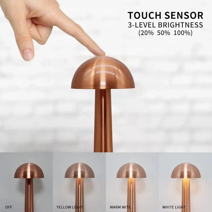 Illuminate your space with elegance and functionality using the Glowave Portable LED Mushroom Table Lamp. With a sleek, mushroom-inspired design, this wireless lamp brings a soft glow to any setting — from cozy bedside corners to elegant dining tables. Featuring a built-in touch sensor with 3 color modes (Warm, Neutral, and Cool White), it adapts to your mood with a simple tap. The dimmable brightness offers personalized comfort, while the rechargeable "C" type USB port ensures hassle-free, cordless use. A modern blend of form and function — perfect for contemporary living.