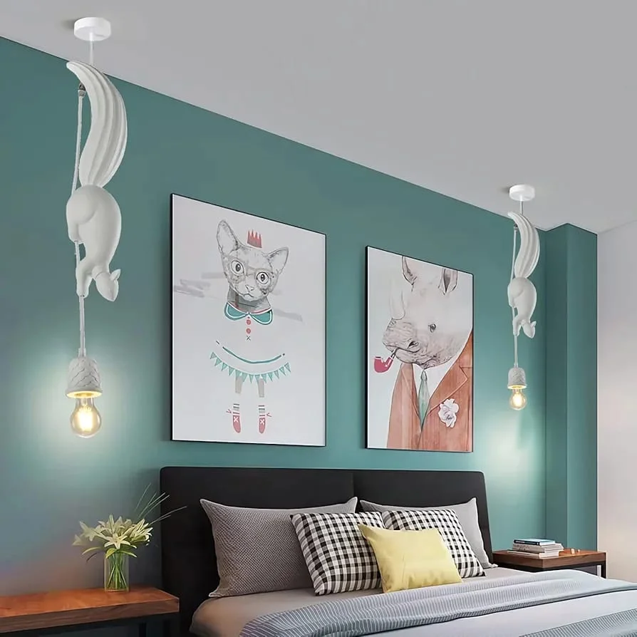 Illuminate your child's room with charm and style with our Cute Squirrel Bedside Pendant Hanging Light Ceiling Lamp. This adorable lighting fixture features a warm white glow, creating a cozy and inviting atmosphere perfect for bedtime stories and peaceful nights. Crafted with a delightful different animal design, it adds a playful touch to any kids' room decor. The bulb is included. Ideal for enhancing your child's bedroom with both functionality and fun, this pendant light combines whimsical aesthetics with practical lighting solutions.