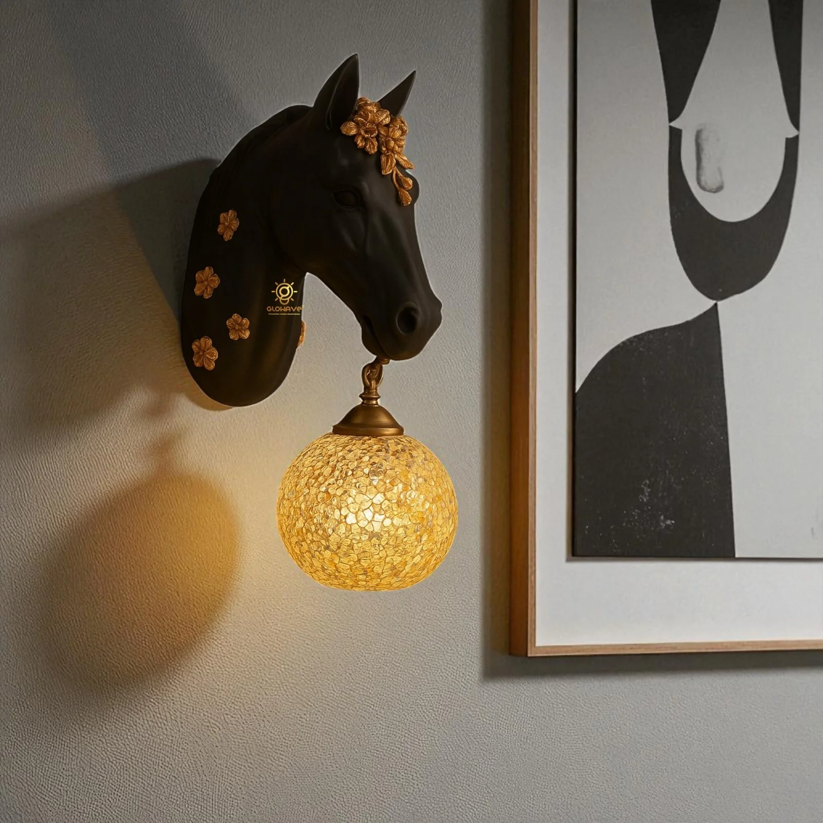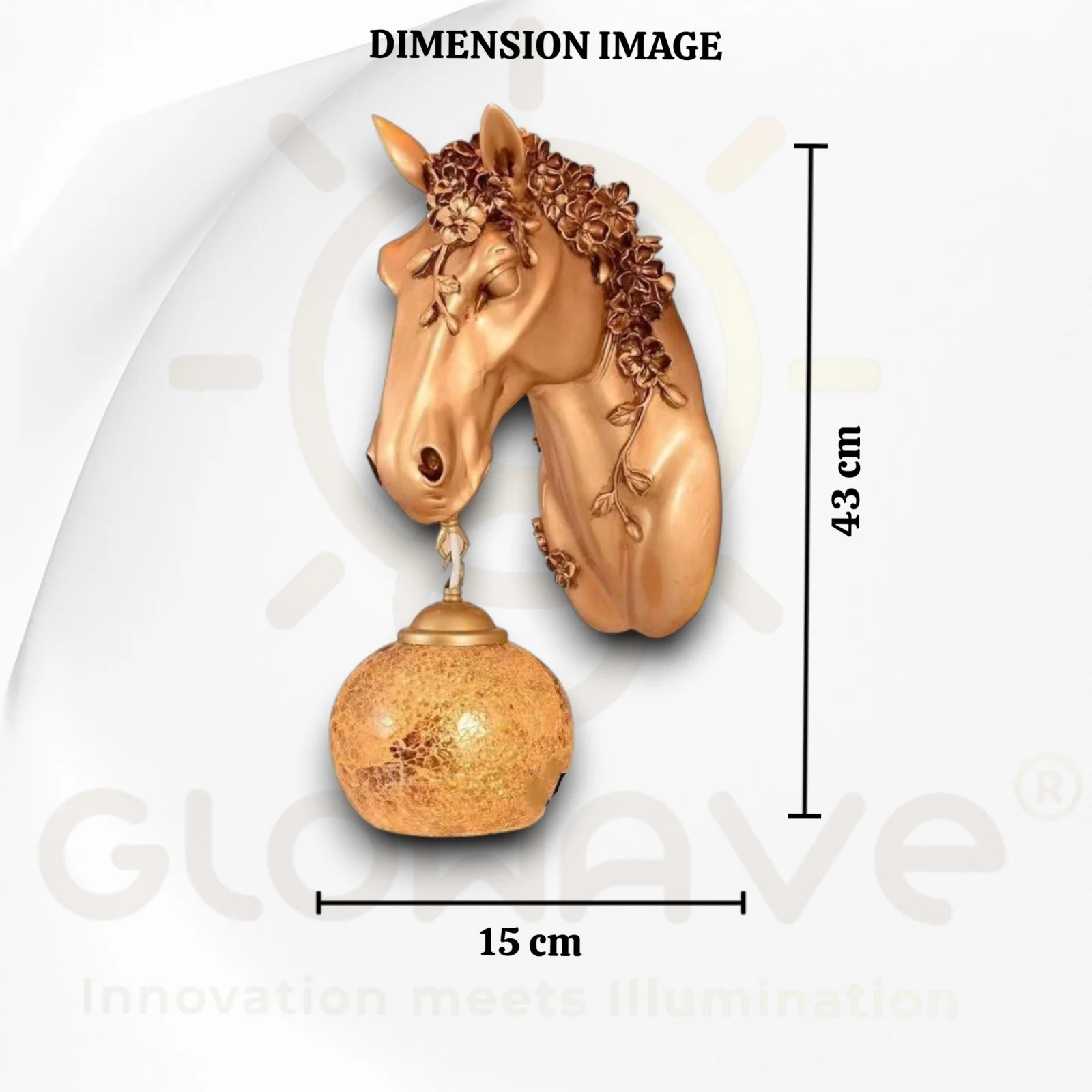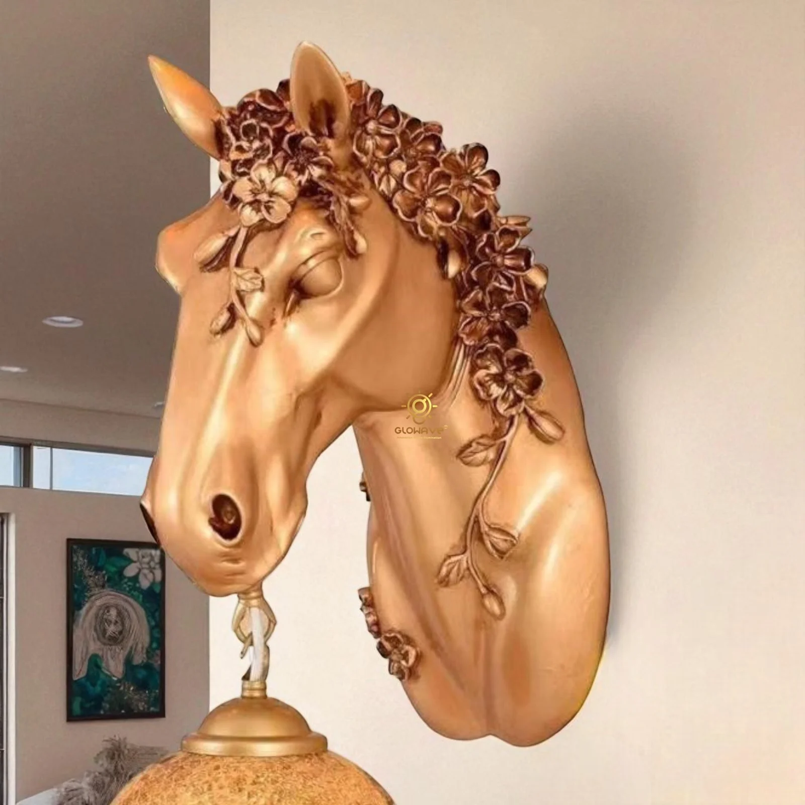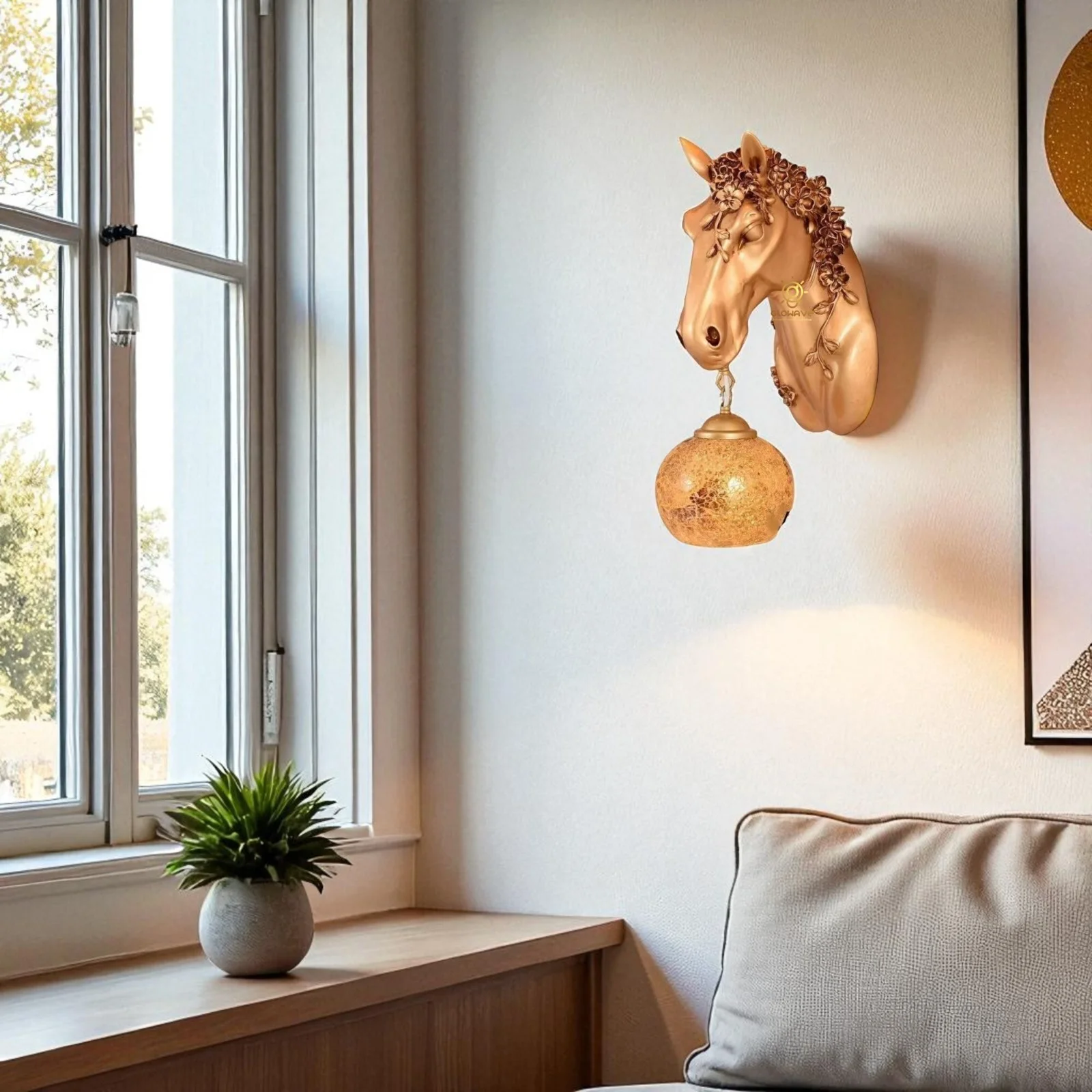 Illuminate your space with the Royal Horse Head Resin Golden Wall Lamp, perfect for living rooms, bedrooms, and bedsides. This exquisite warm white lamp features a majestic horse head design, adding a touch of luxury and elegance to any decor. Crafted from high-quality metal with a stunning golden finish, it provides a warm, inviting glow that enhances the ambiance of your home. Ideal for those seeking a blend of sophistication and functionality, this wall lamp is a statement piece that elevates your interior design.