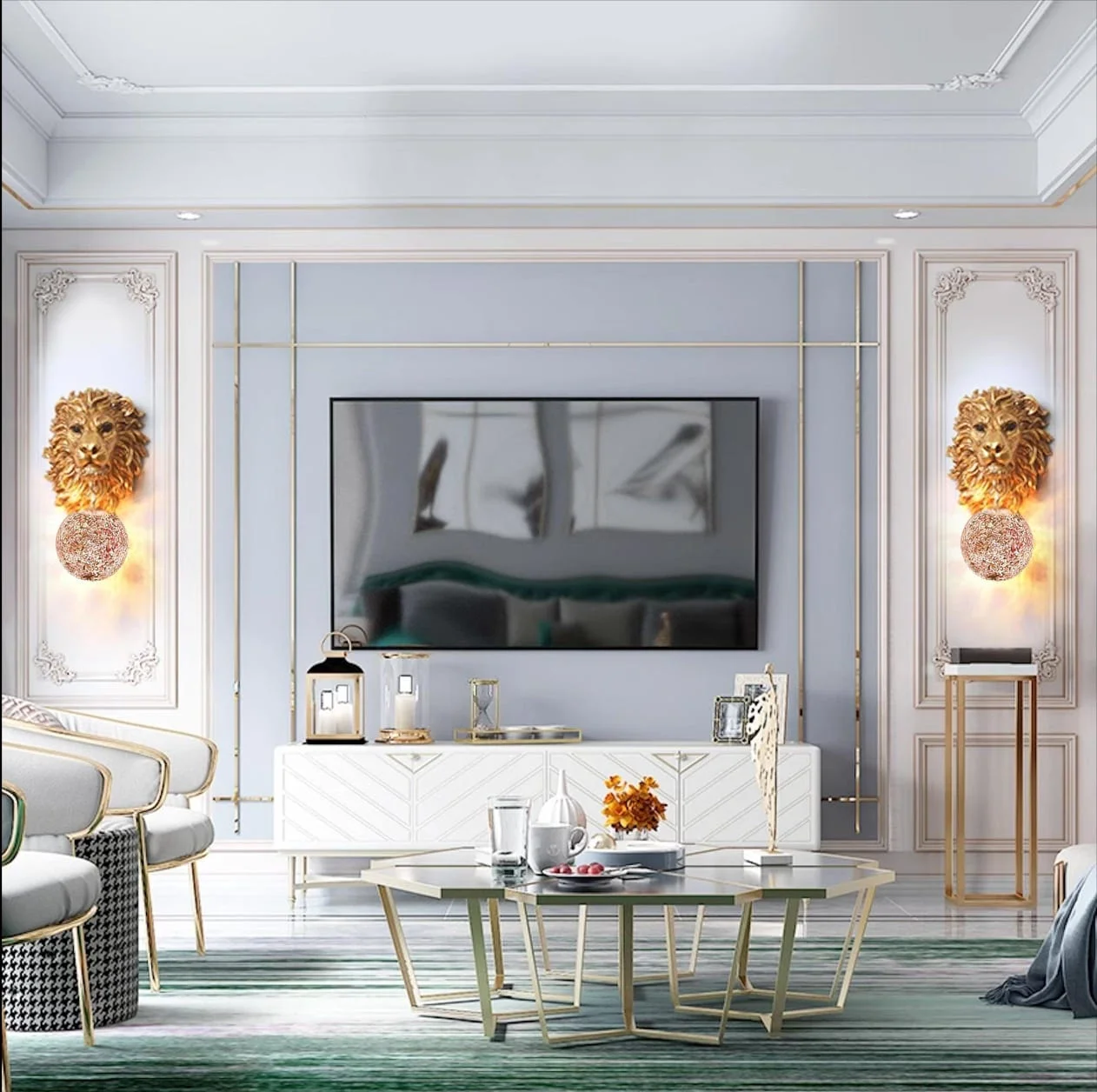 Illuminate your space with the Royal Lion Head Resin Golden Wall Lamp, perfect for living rooms, bedrooms, and bedsides. This exquisite warm white lamp features a majestic lion head design, adding a touch of luxury and elegance to any decor. Crafted from high-quality metal with a stunning golden finish, it provides a warm, inviting glow that enhances the ambiance of your home. Ideal for those seeking a blend of sophistication and functionality, this wall lamp is a statement piece that elevates your interior design.