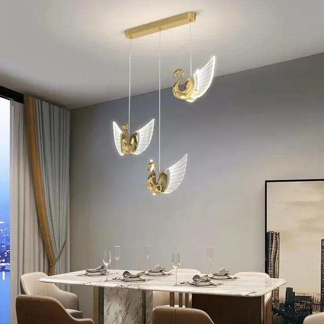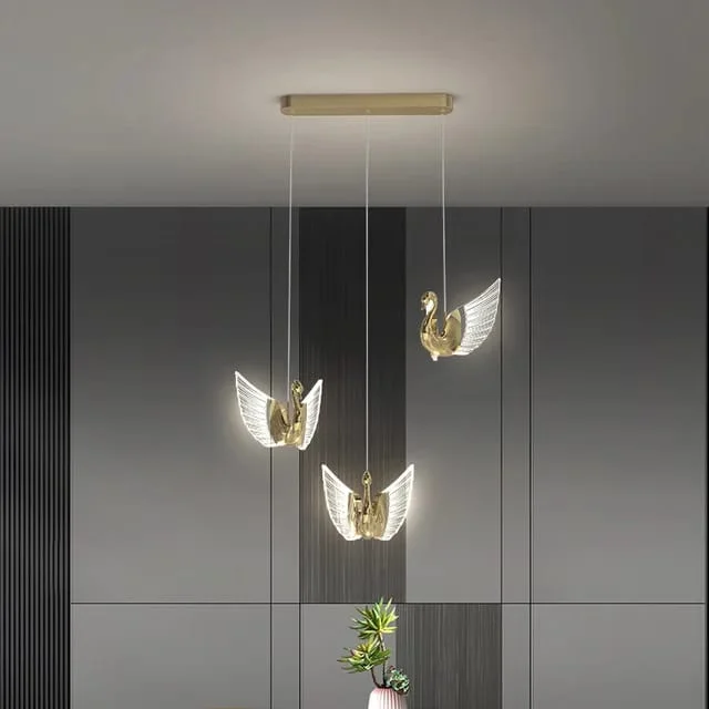 "Add brilliance to any space with our LED Gold Crystal Set of 3 Swans Pendant Light. This minimalist swan hanging light boasts a sophisticated design, perfect for bedrooms, kitchens, entryways, bathrooms, living rooms, lobbies, and restaurants alike. With its tricolor light feature, it offers versatile ambiance to suit any mood or occasion. Illuminate your space with elegance and style today!"