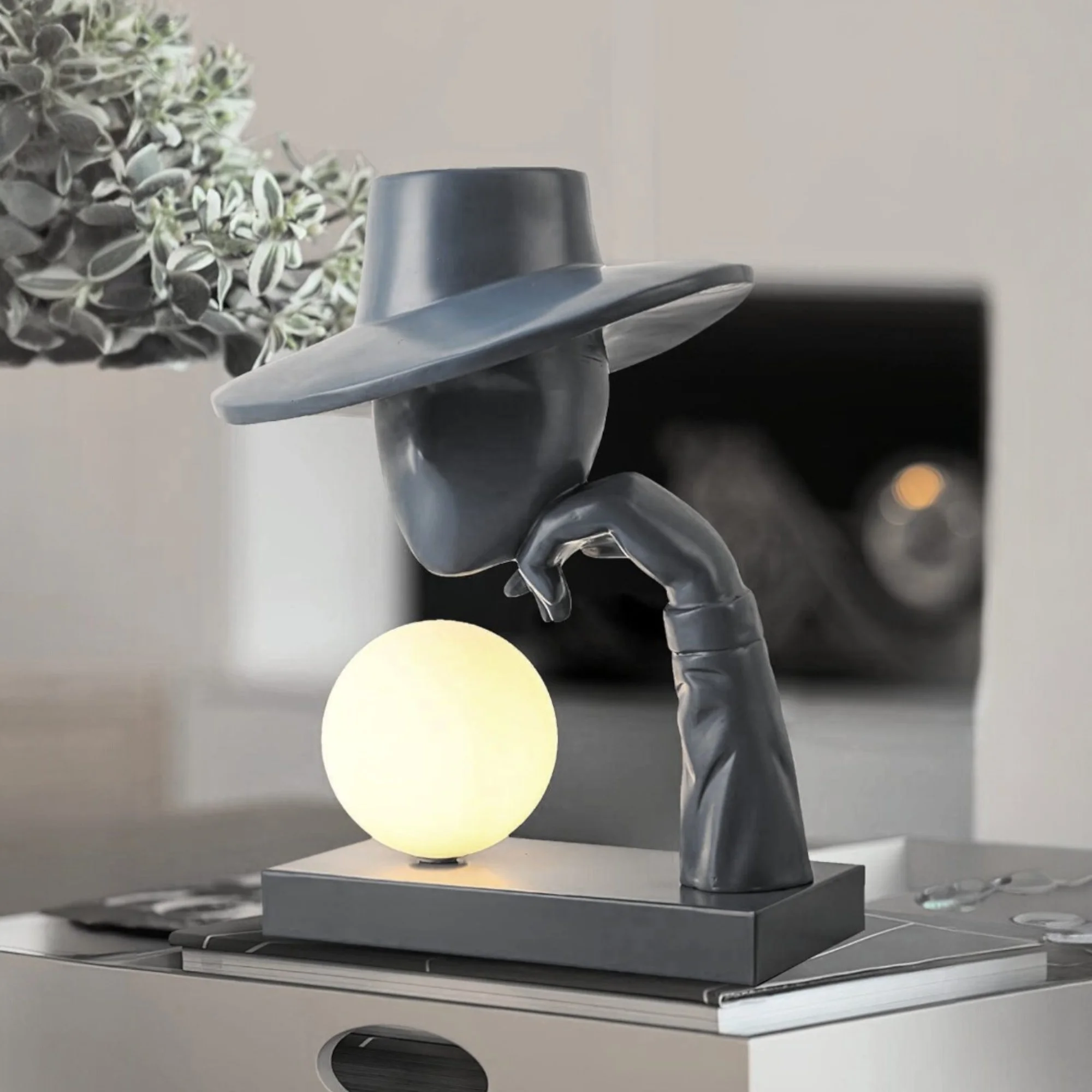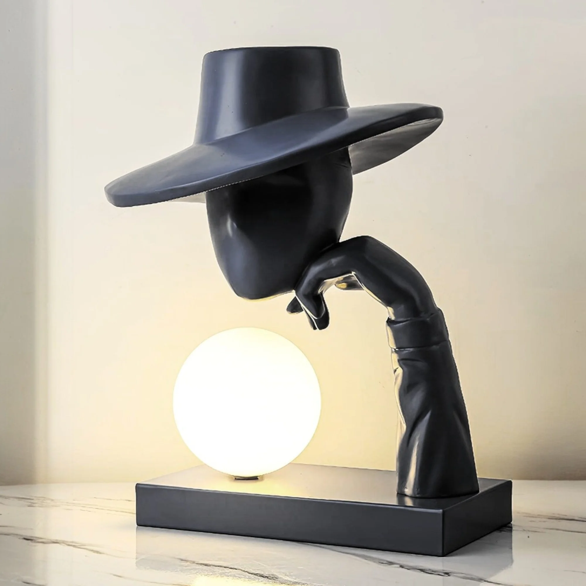 Add an artistic touch to your space with the Modern Abstract Art Black Resin Sculpture Hat-Wearing Human Figure Bedside Table Lamp. This unique piece combines functionality and art, featuring a human figure with a stylish hat, crafted from premium black resin. Designed to be both an eye-catching sculpture and a warm white light source, it’s the perfect addition to your bedroom, living room, or office. The warm white LED creates a cozy atmosphere, making it ideal for bedside use. With its modern abstract style, this lamp is perfect for those looking to elevate their decor with a sophisticated, artistic flair.