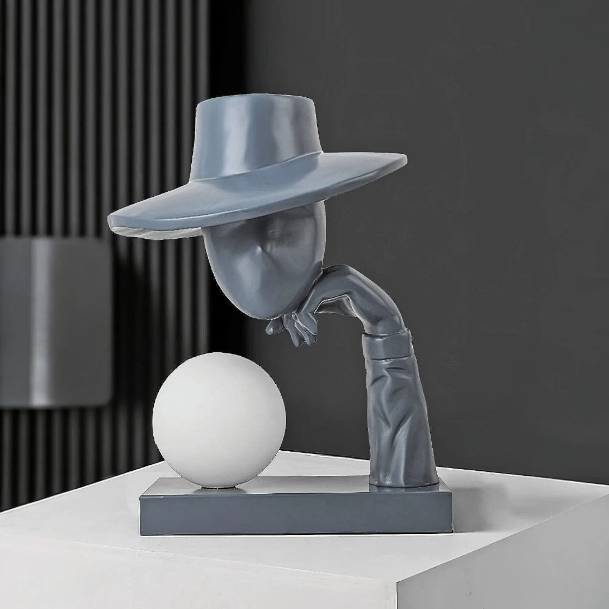 - Unique Design: Black resin sculpture with an abstract human figure wearing a hat, adding a modern art aesthetic to any room.
