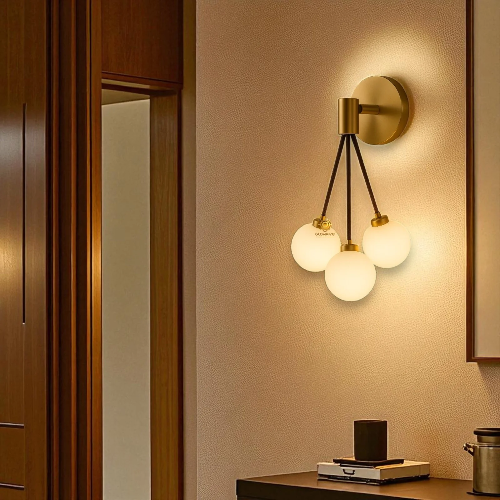 Elevate your living space with the Modern Glass Circular Shape Balls Golden Finish LED Wall Lamp. This elegant lighting fixture, perfect for your living room, bedroom, or bedside, features a sleek golden finish and contemporary glass balls design.
